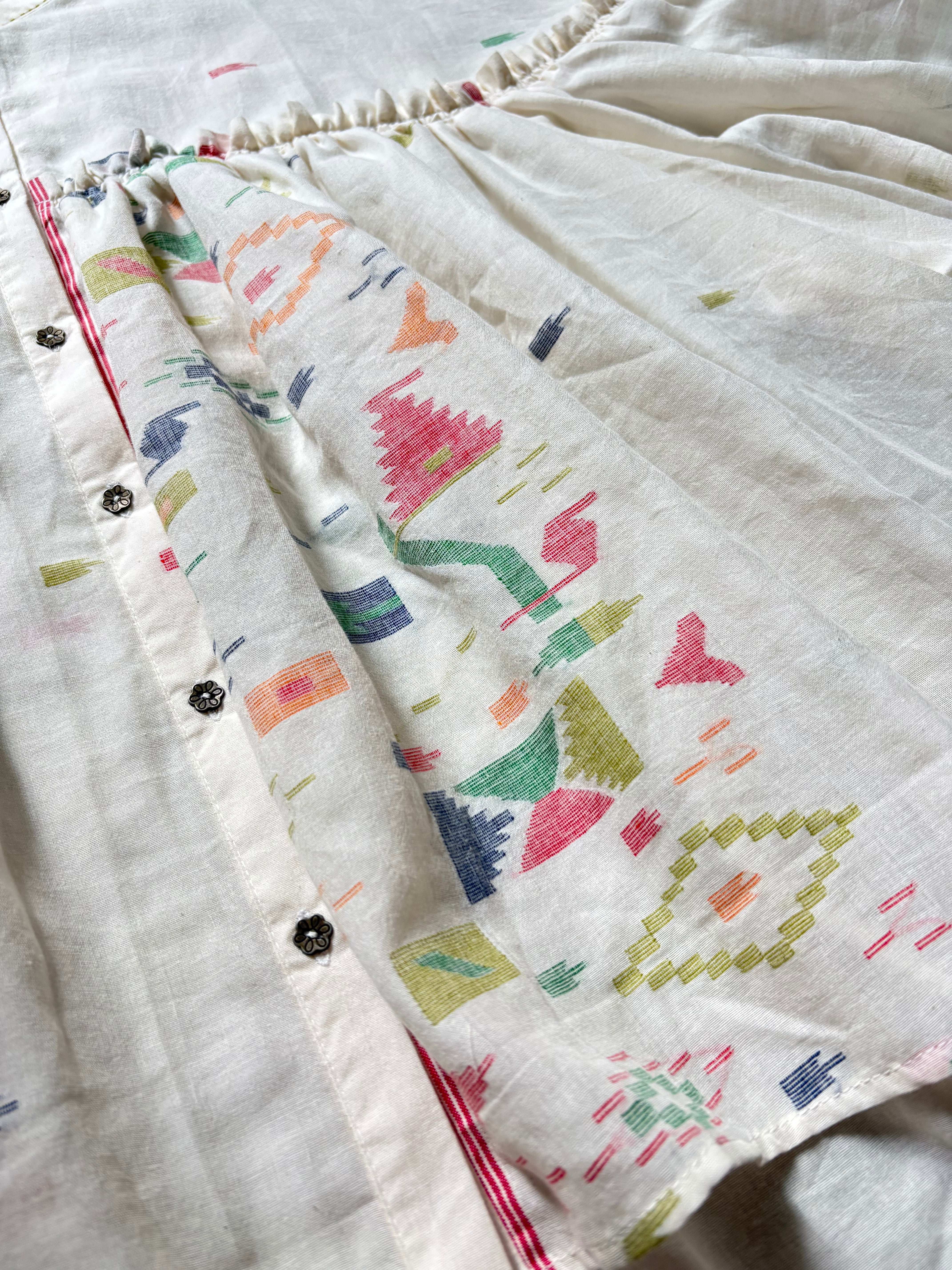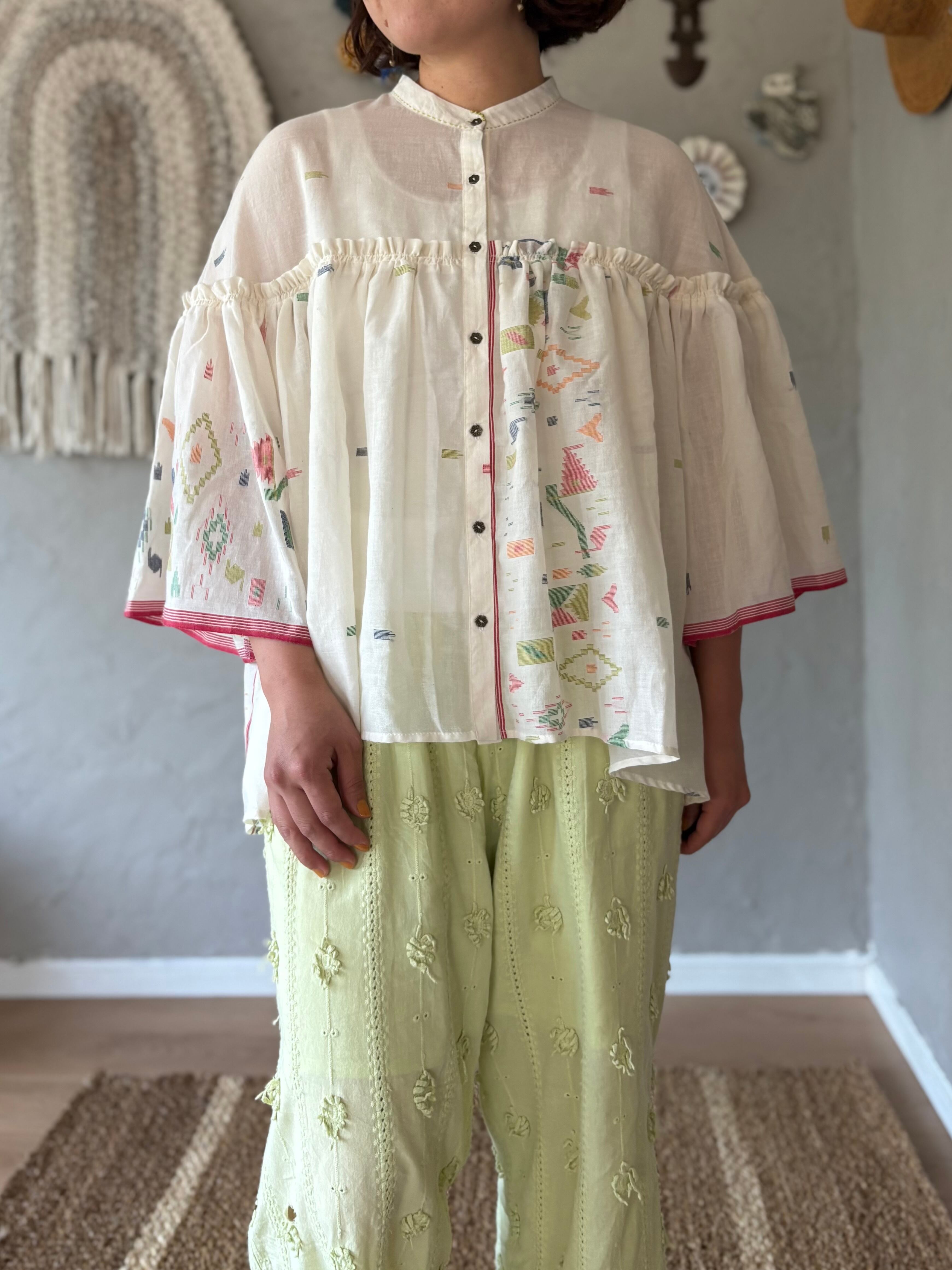 プリントでも刺繍でもなく、手作業で織り込まれたジャムダニ織の模様は、どこか懐かしくて可愛らしい雰囲気。