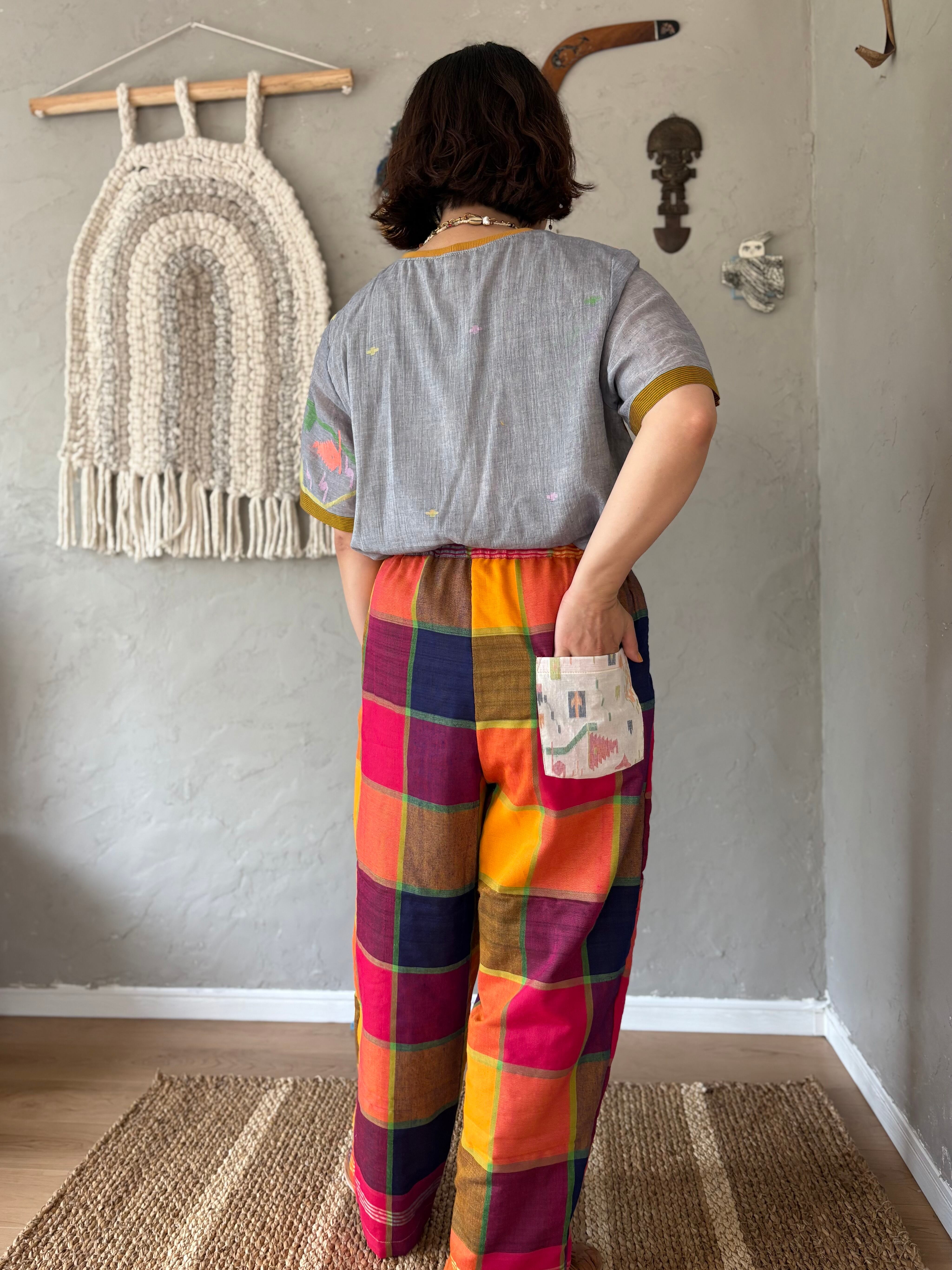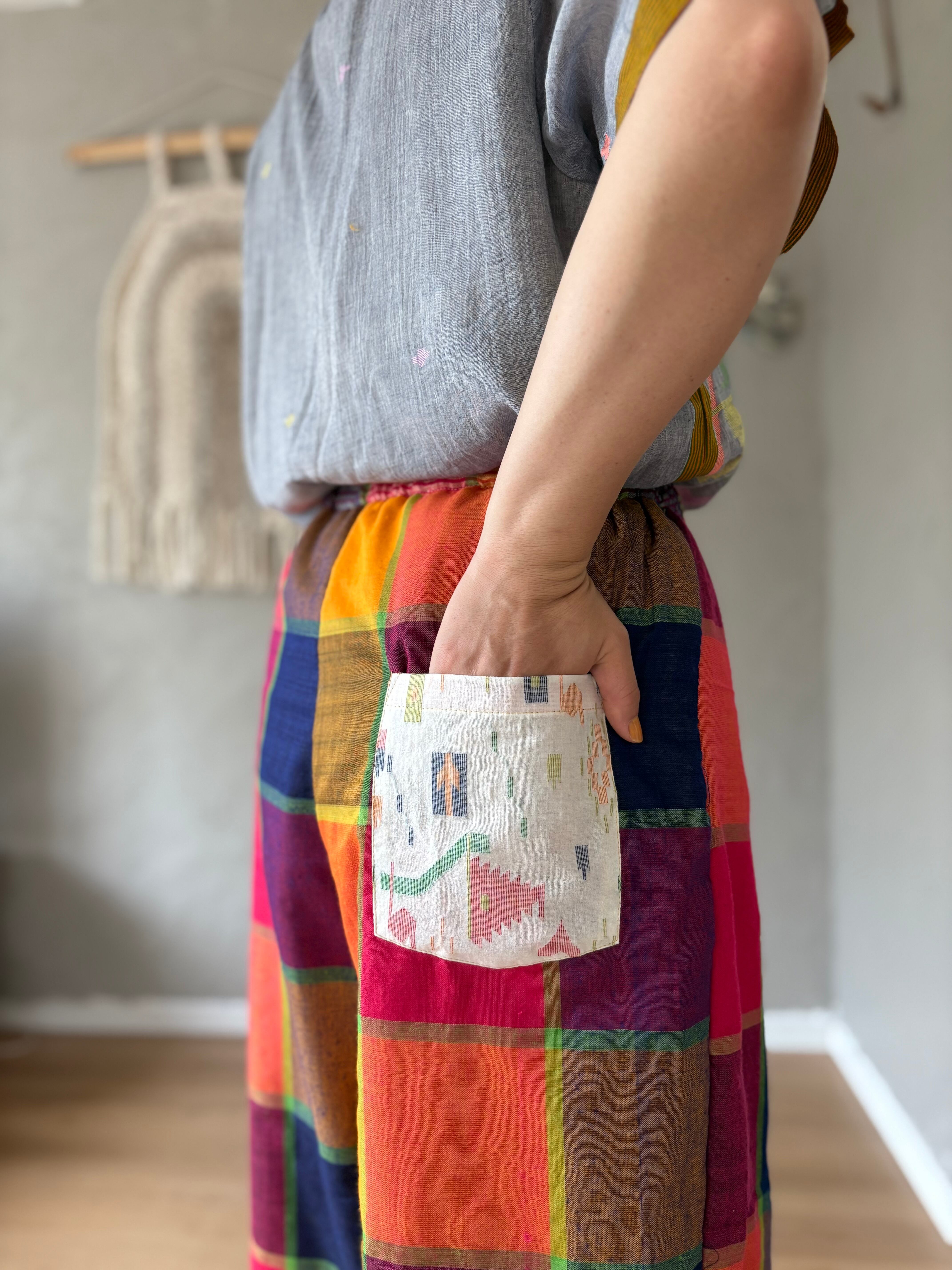 また、後ろポケットには、別の幾何学模様のジャムダニ生地をアクセントとして使用。
