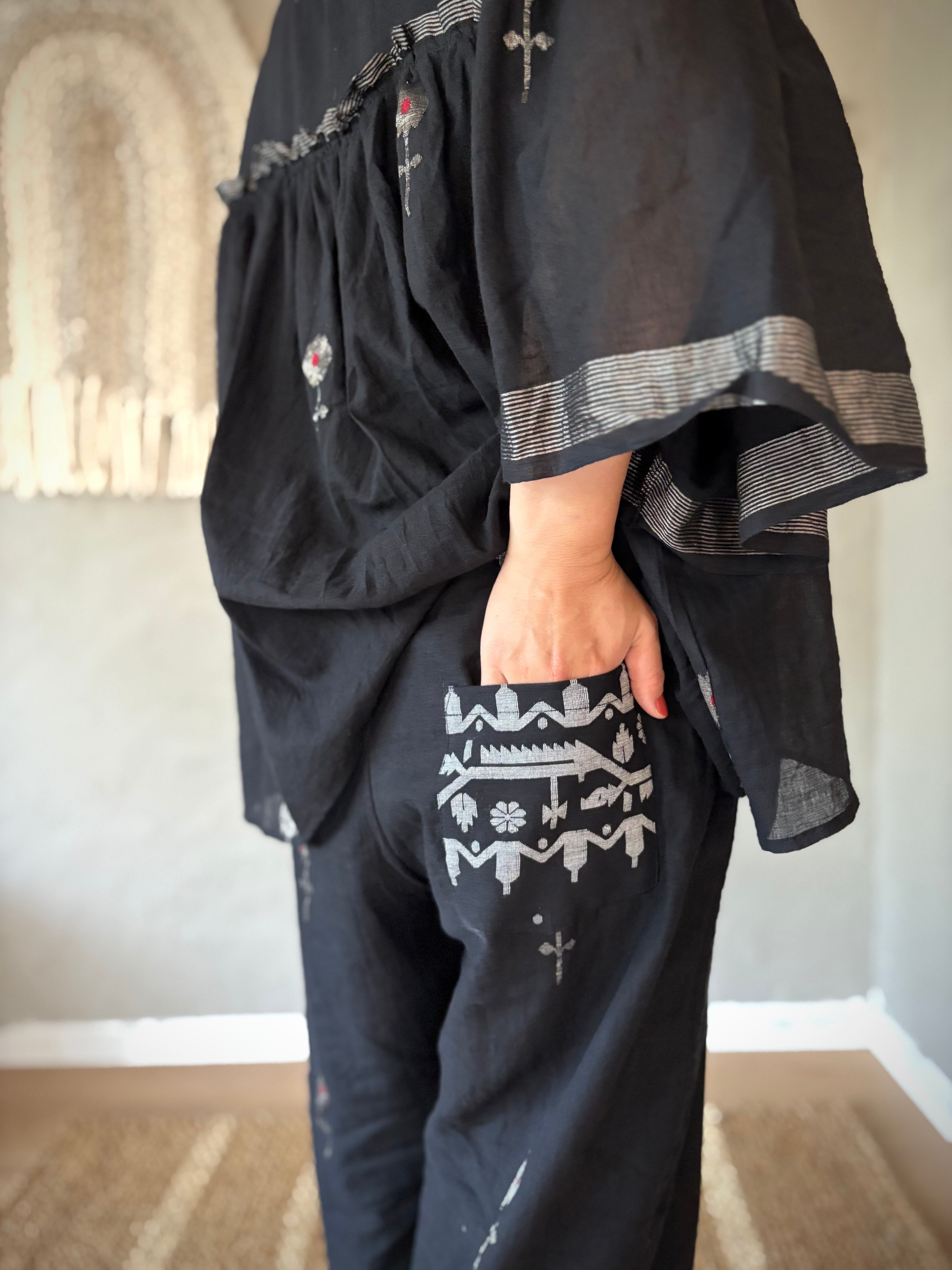 また、後ろポケットには、別の幾何学模様のジャムダニ生地をアクセントとして使用。