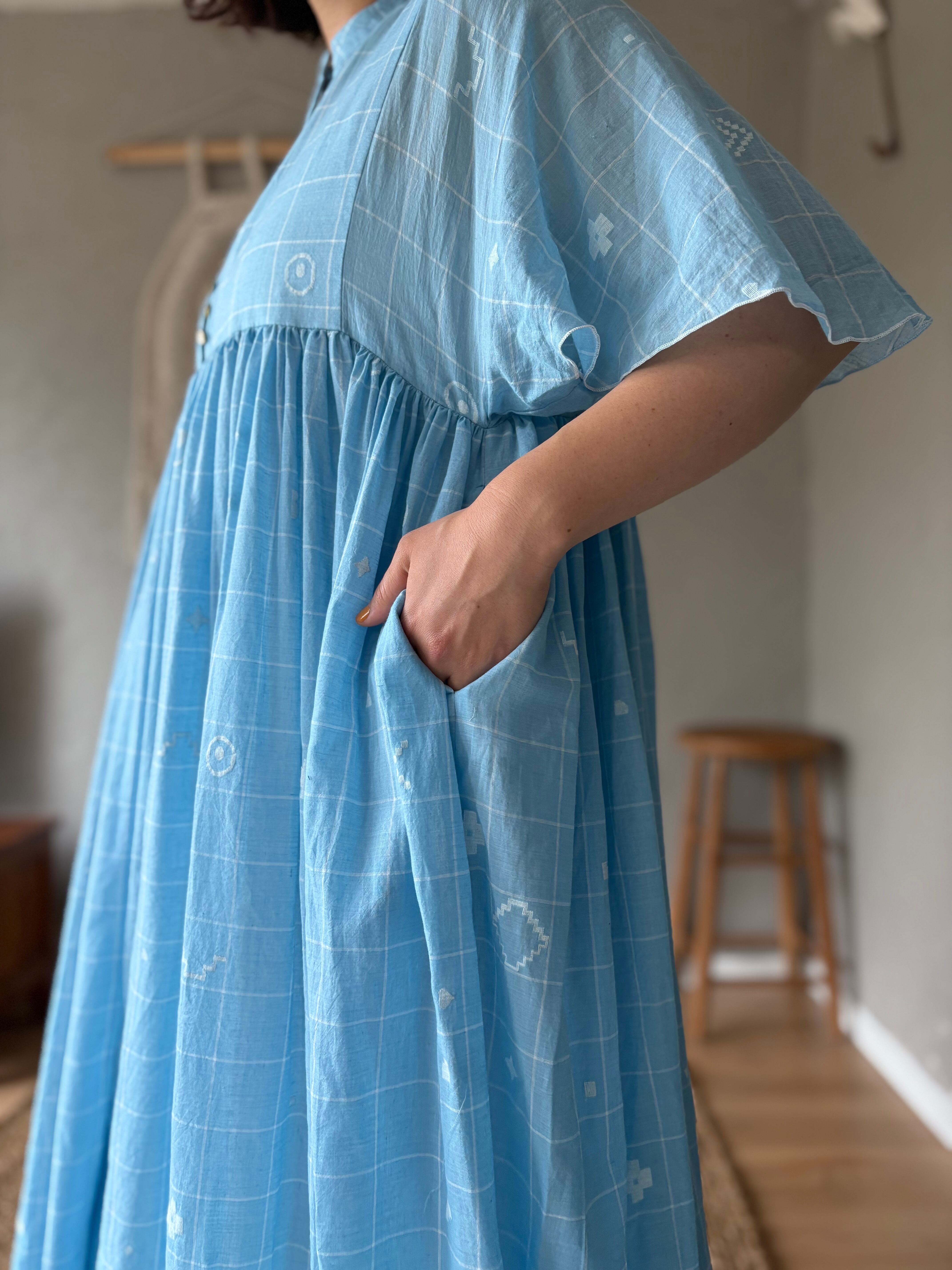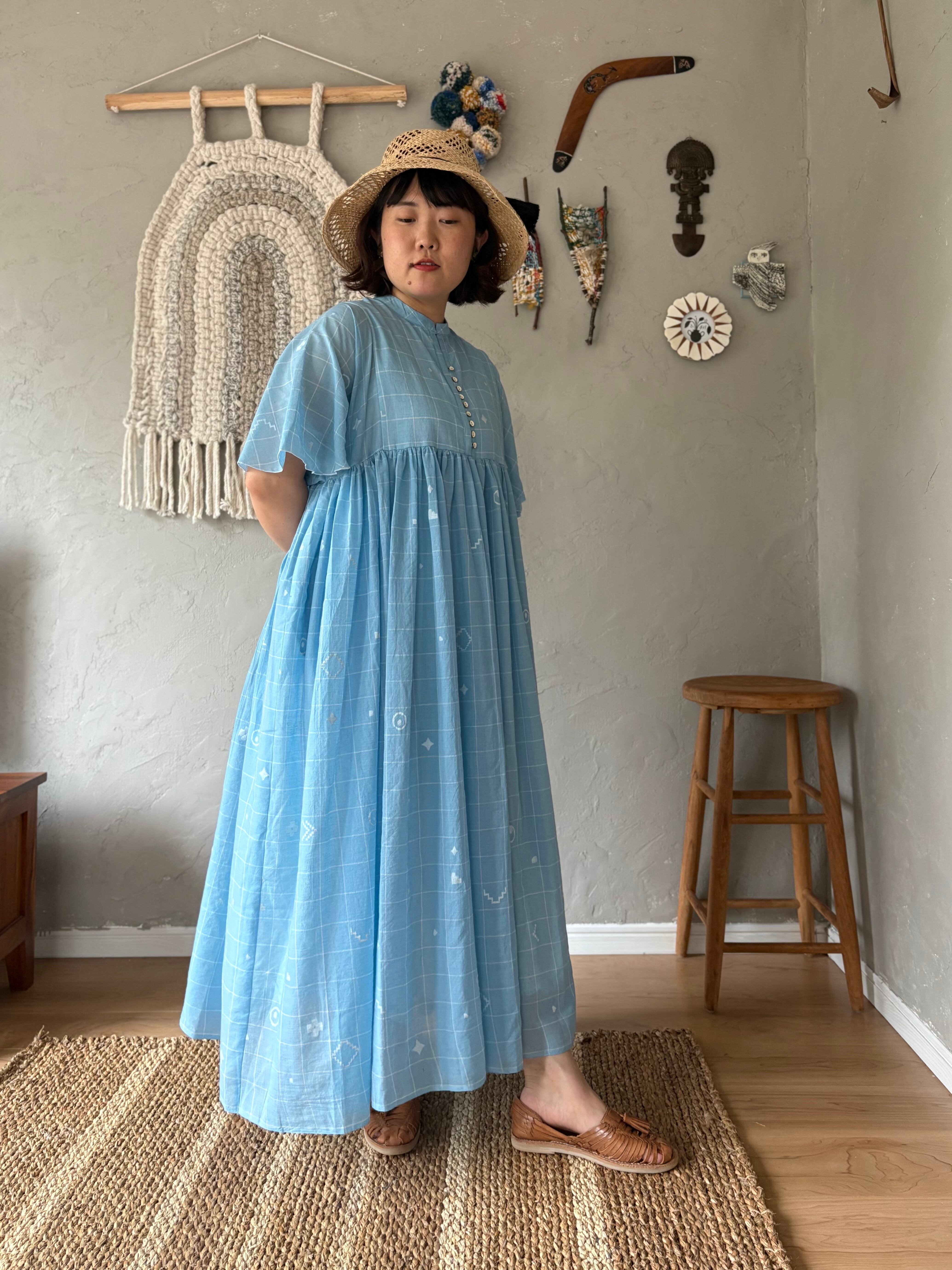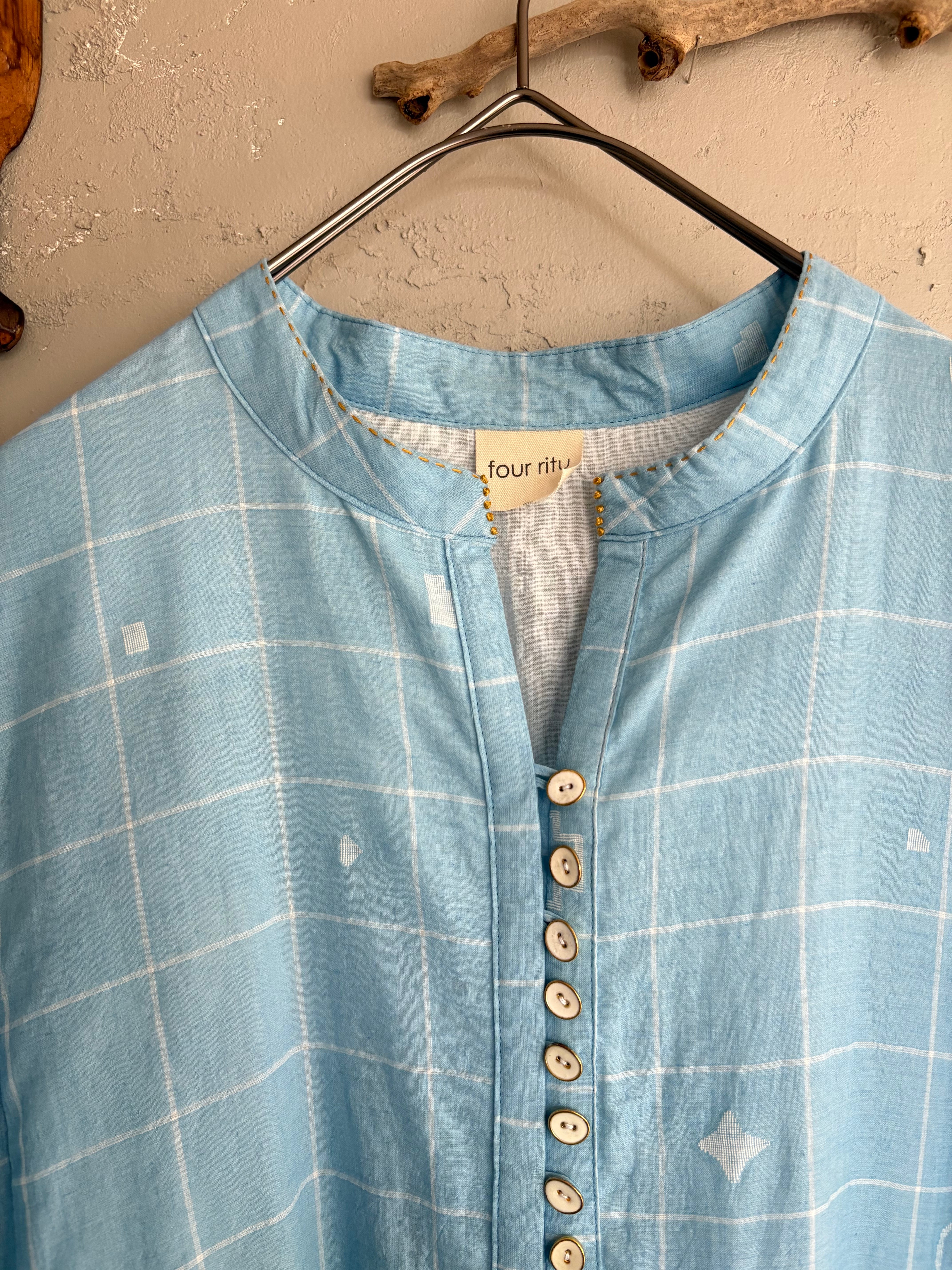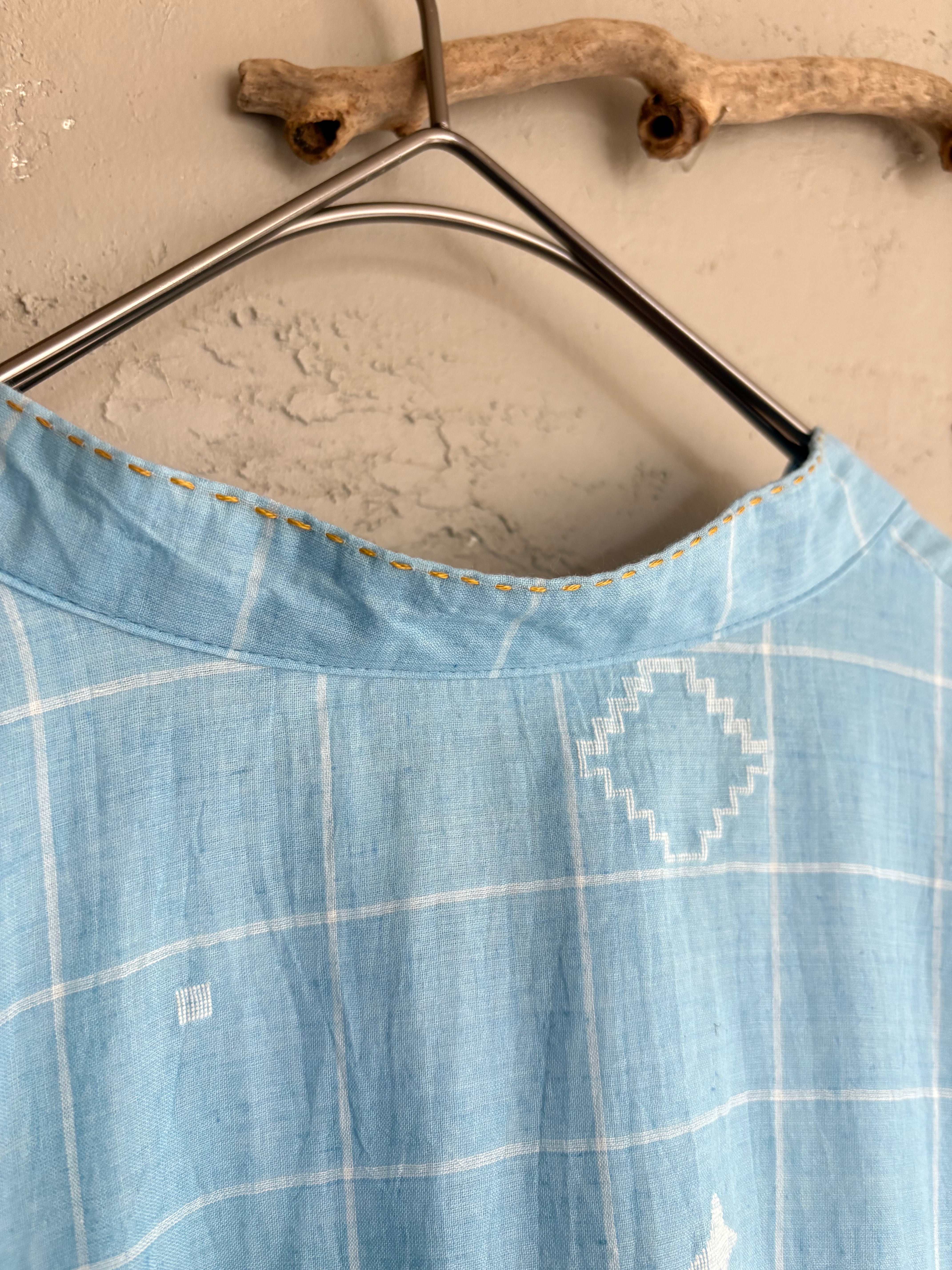 繊細なラインの格子柄の中には、多様なジャムダニ織の模様がランダムに織り込まれています。整然さと遊び心が同居し、可愛らしさと洗練を併せ持つ一着です。