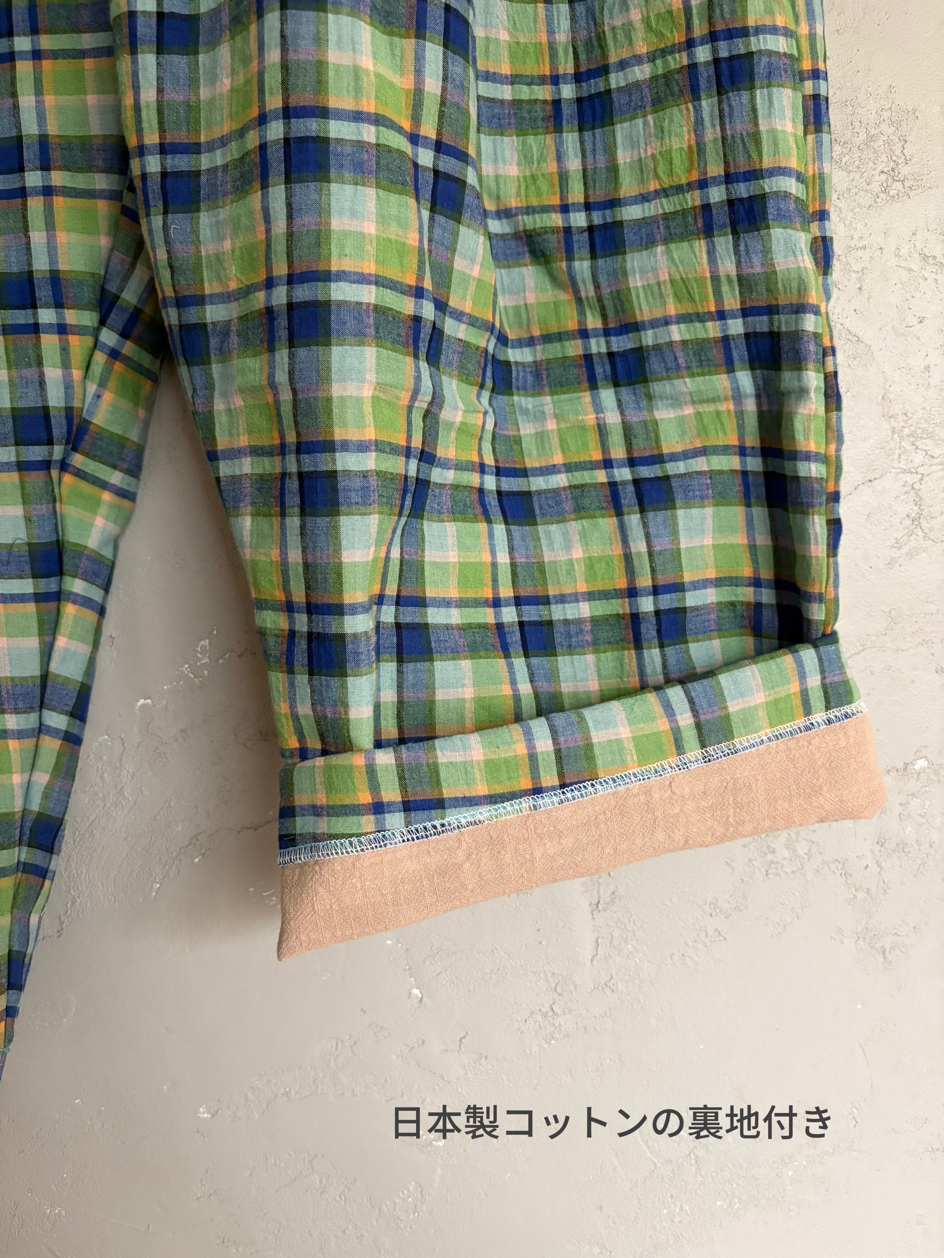 その繊細な布に、日本製コットンの裏地をつけて、履くたびに手仕事を感じるタックテーパードパンツを仕立てました。