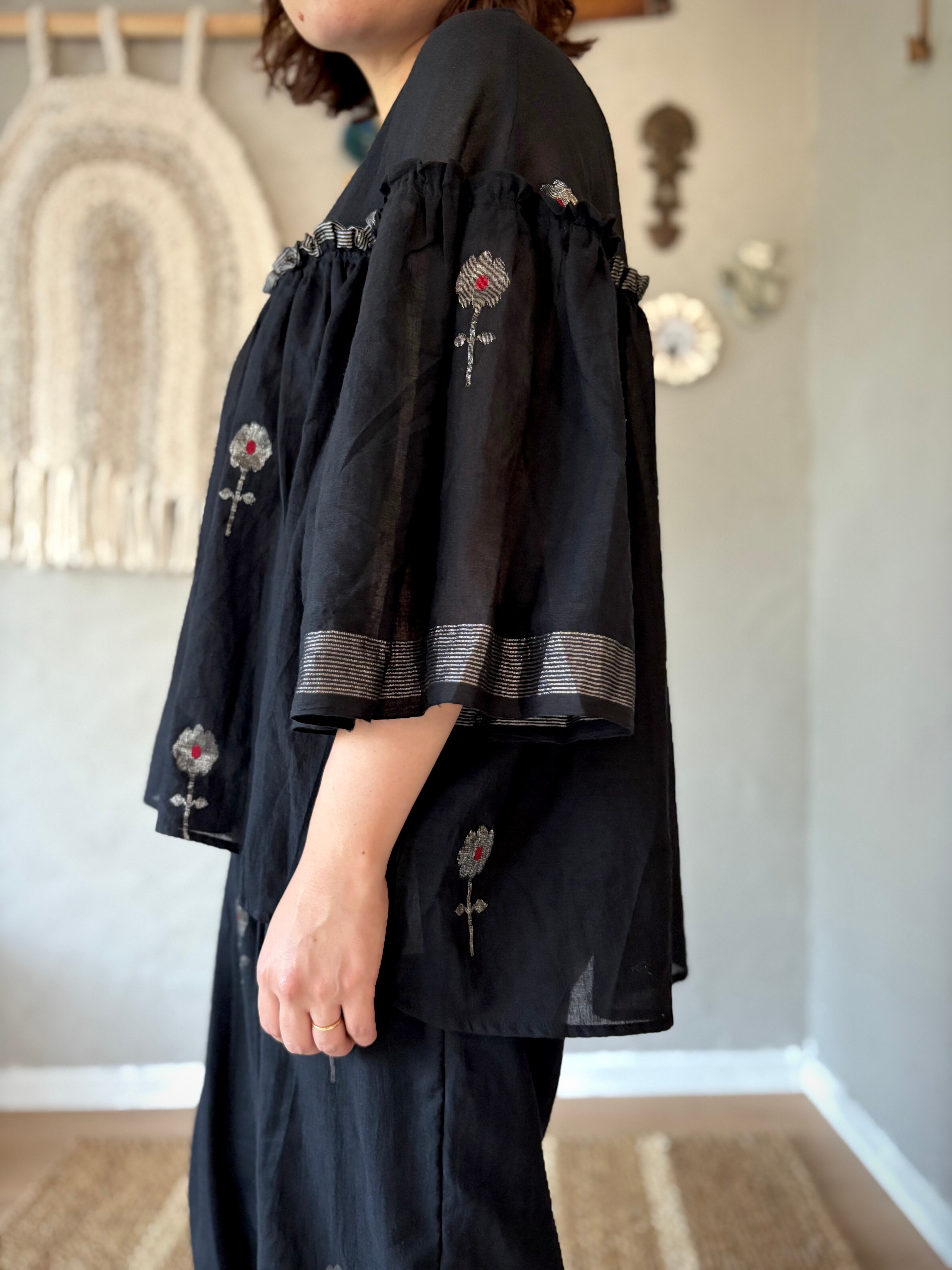 プリントでも刺繍でもなく、手作業で織り込まれたシルバーの丸い花模様は、どこか懐かしくて可愛らしい雰囲気。