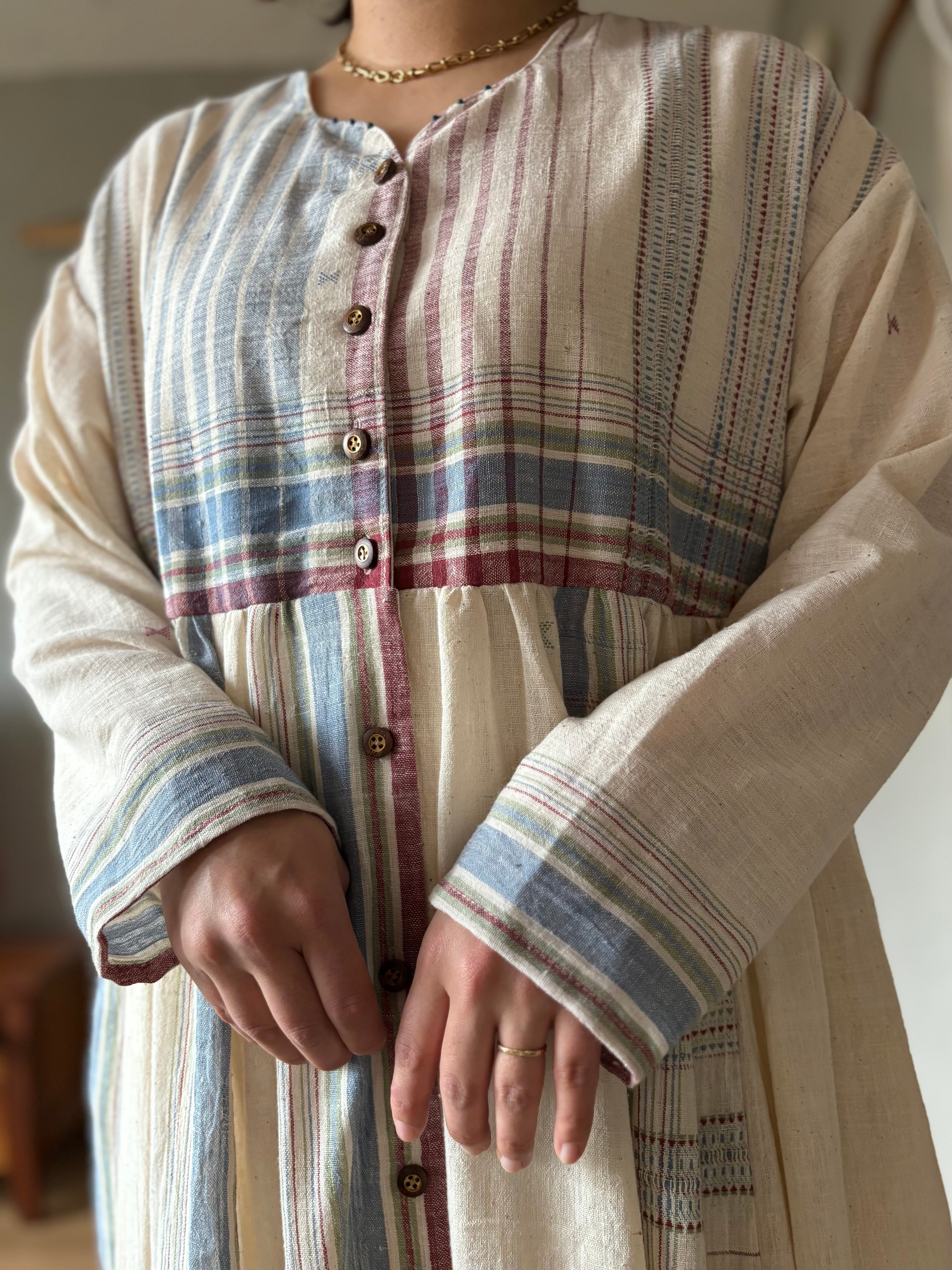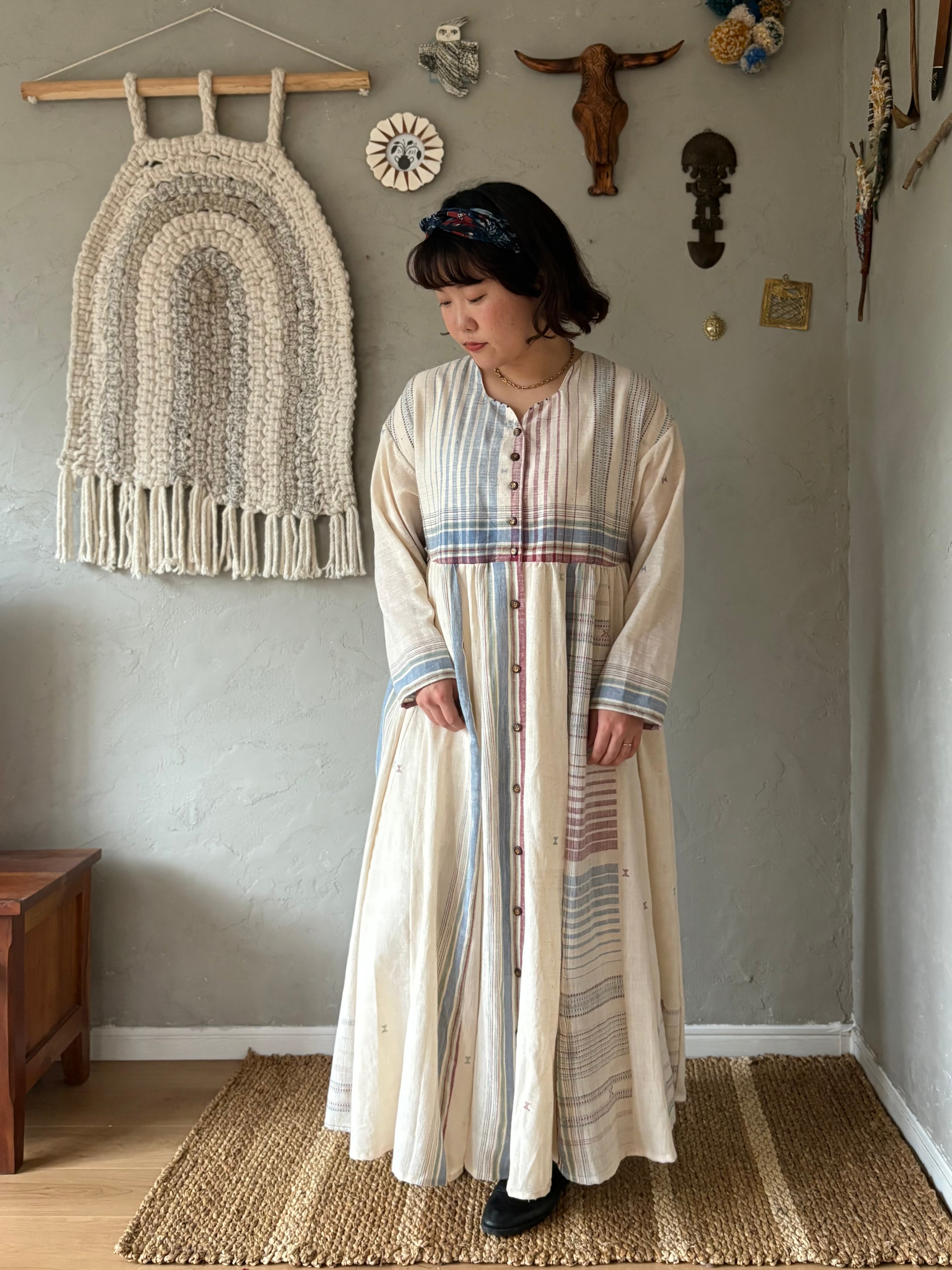 インドの手紡ぎ手織りカラコットンのブジョディサリーを使用。