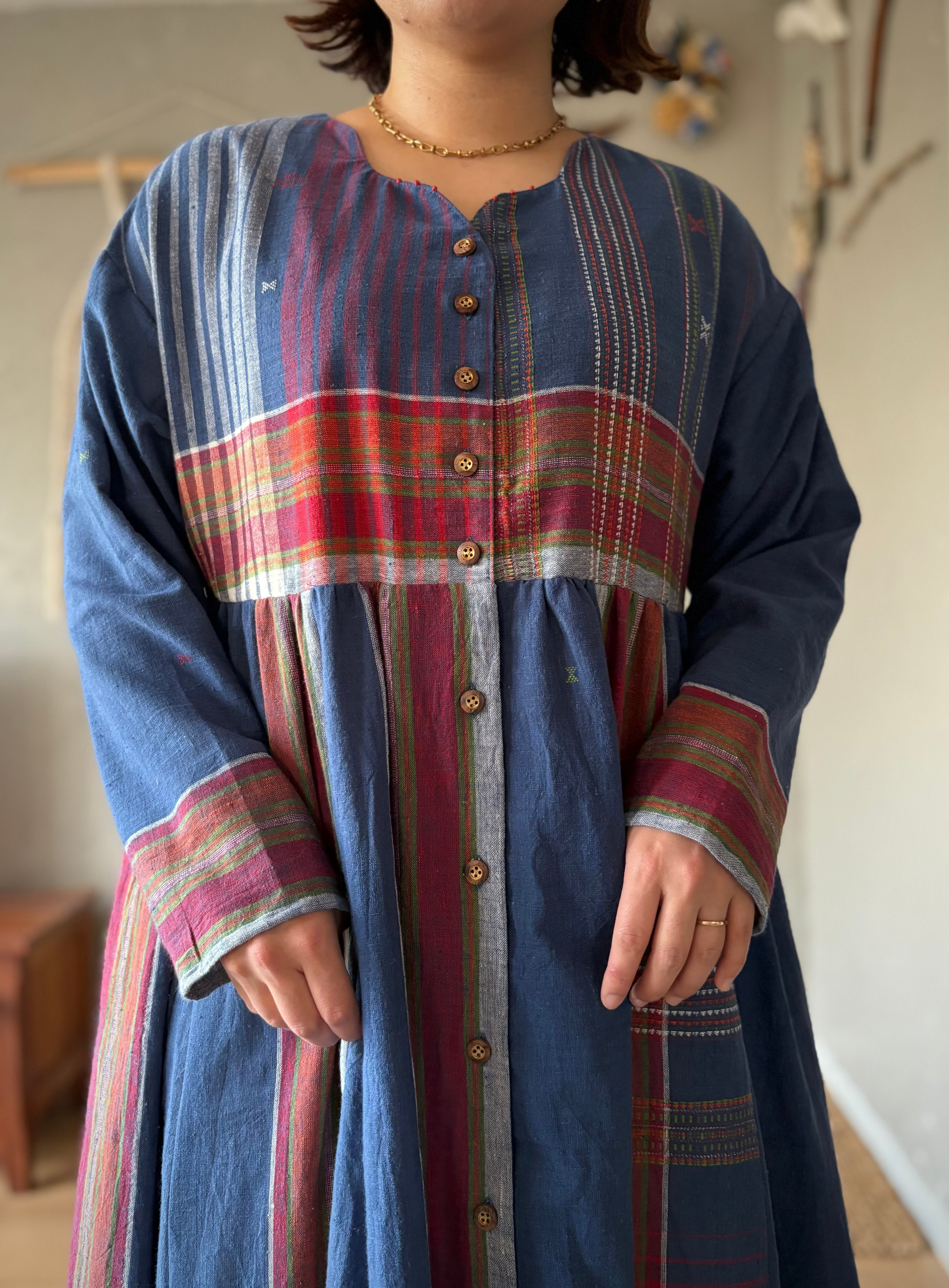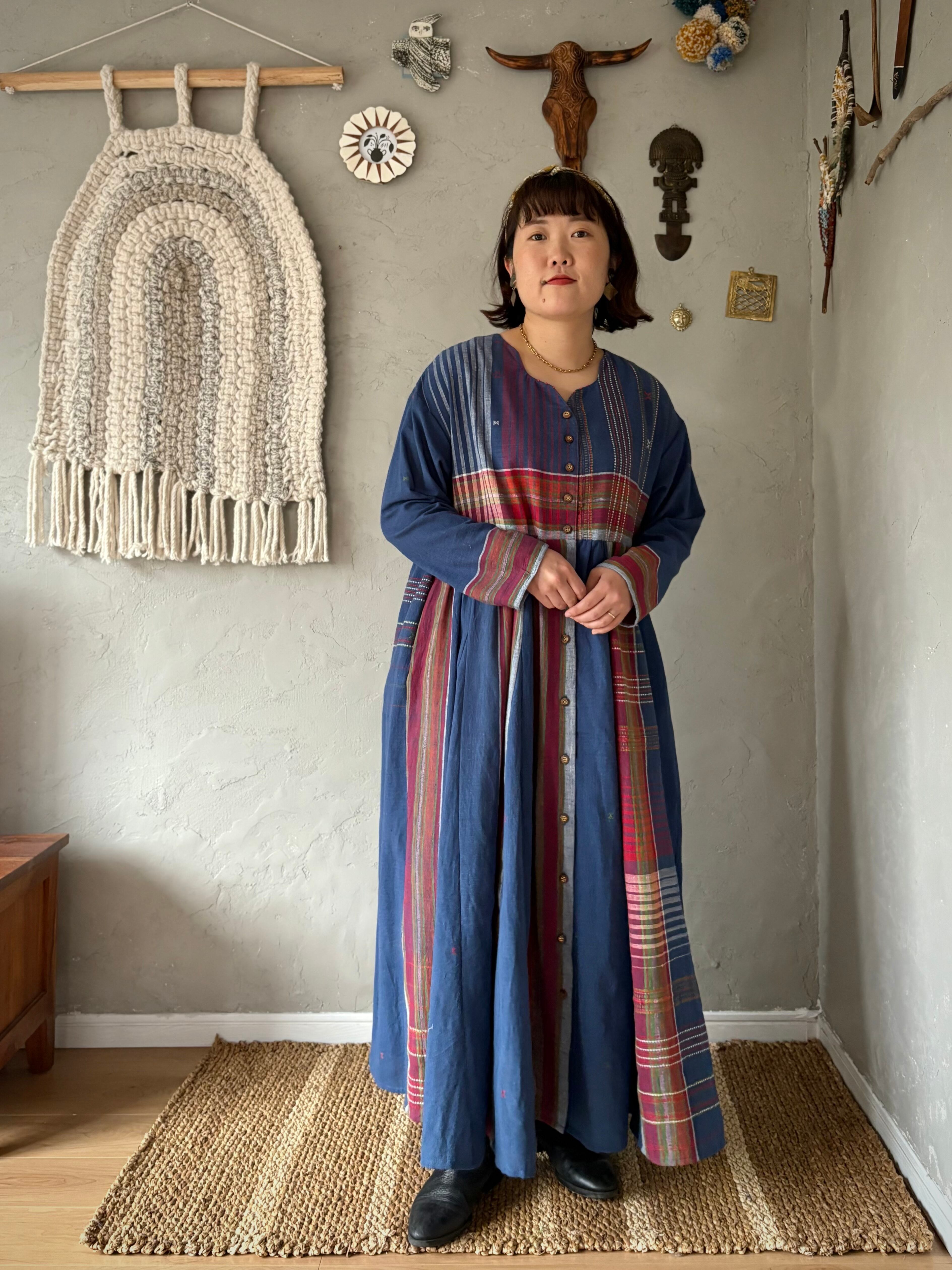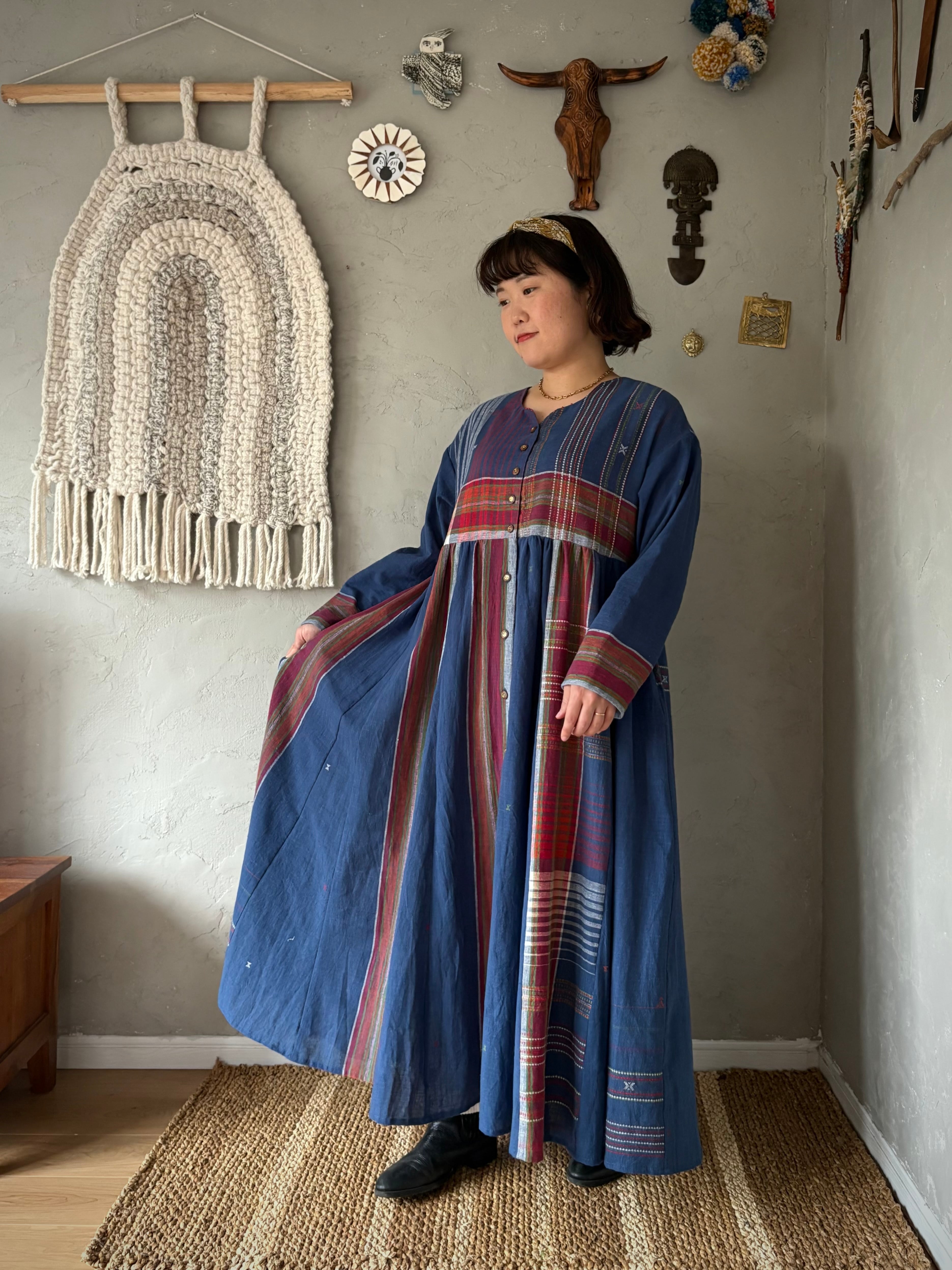 インドの手紡ぎ手織りカラコットンのブジョディサリーを使用。