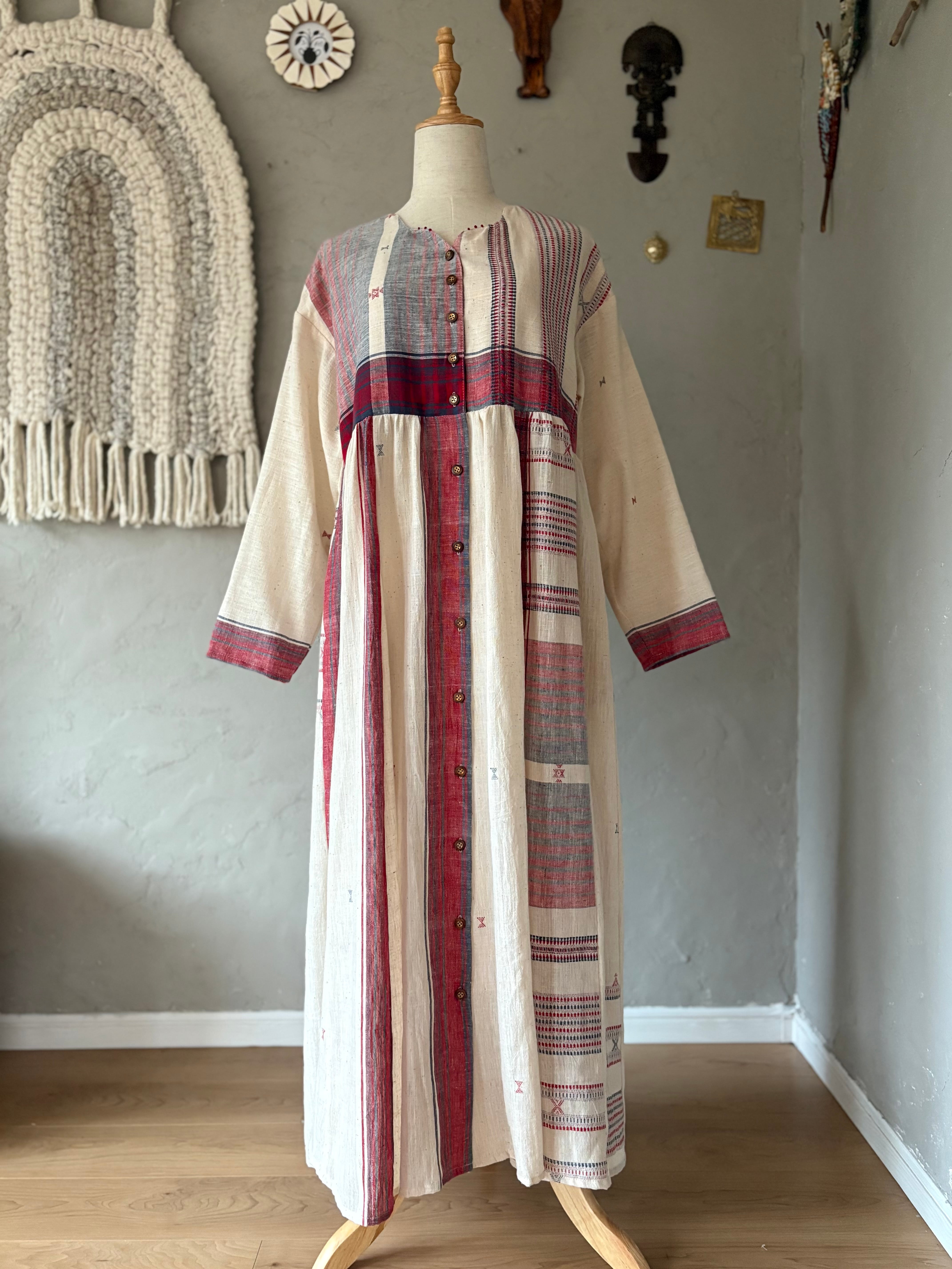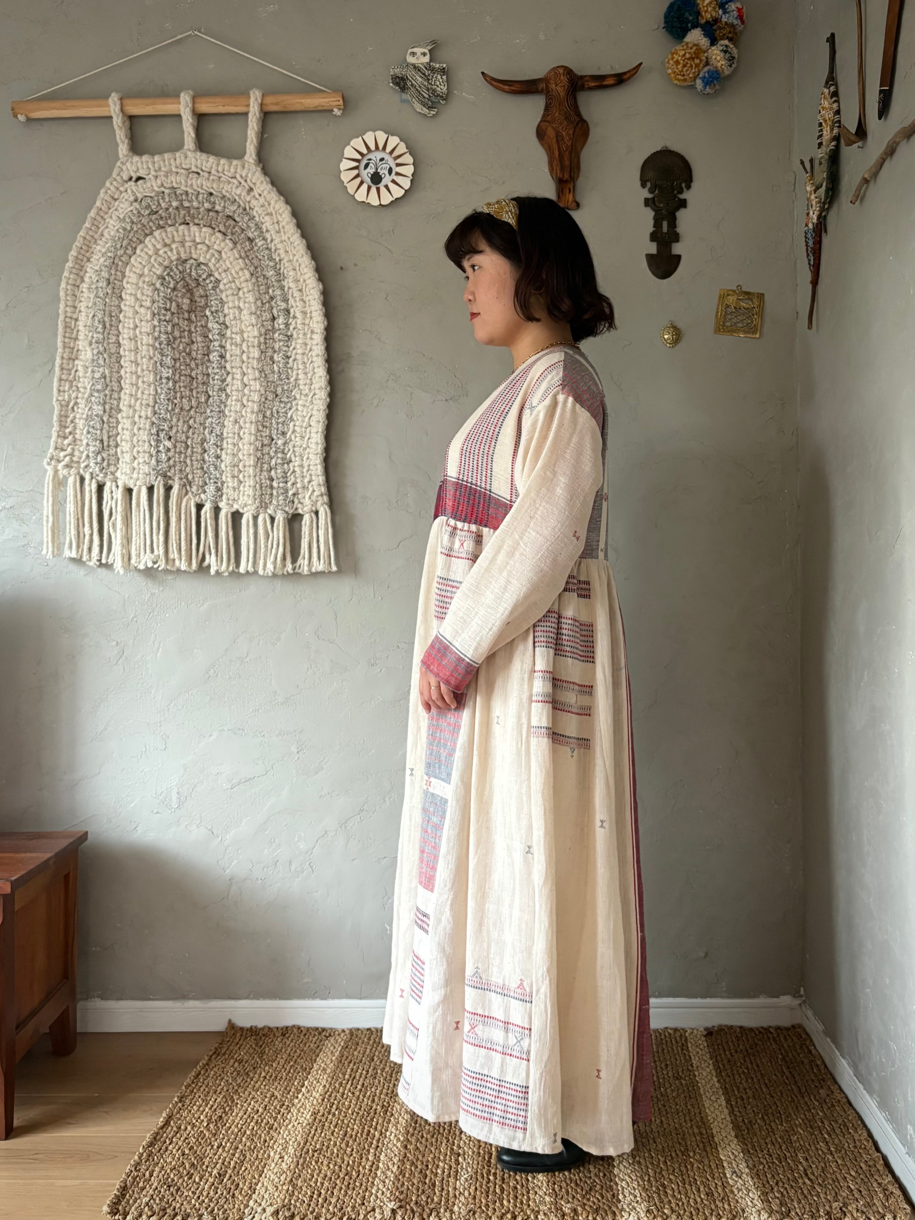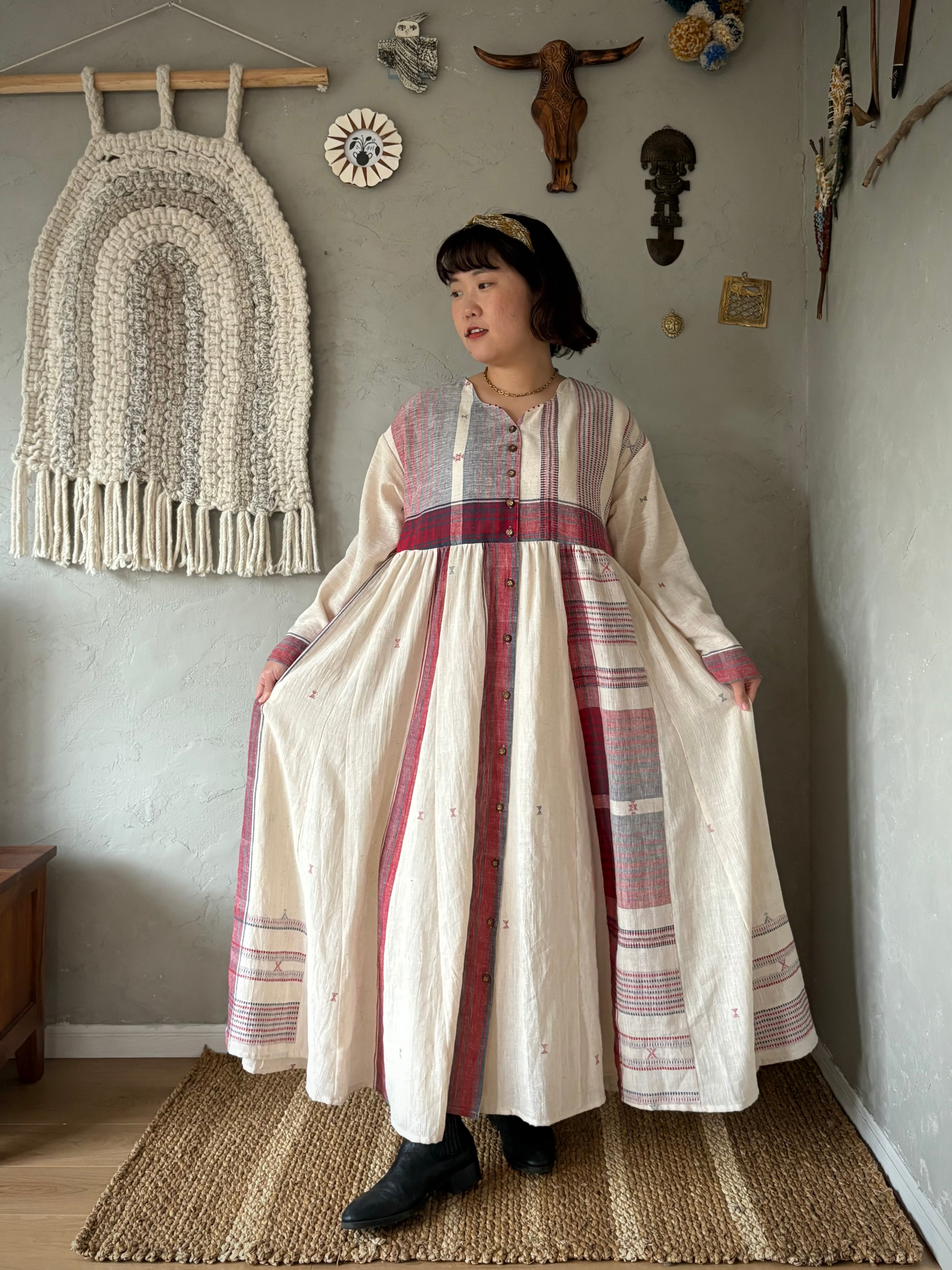 インドの手紡ぎ手織りカラコットンのブジョディサリーを使用。