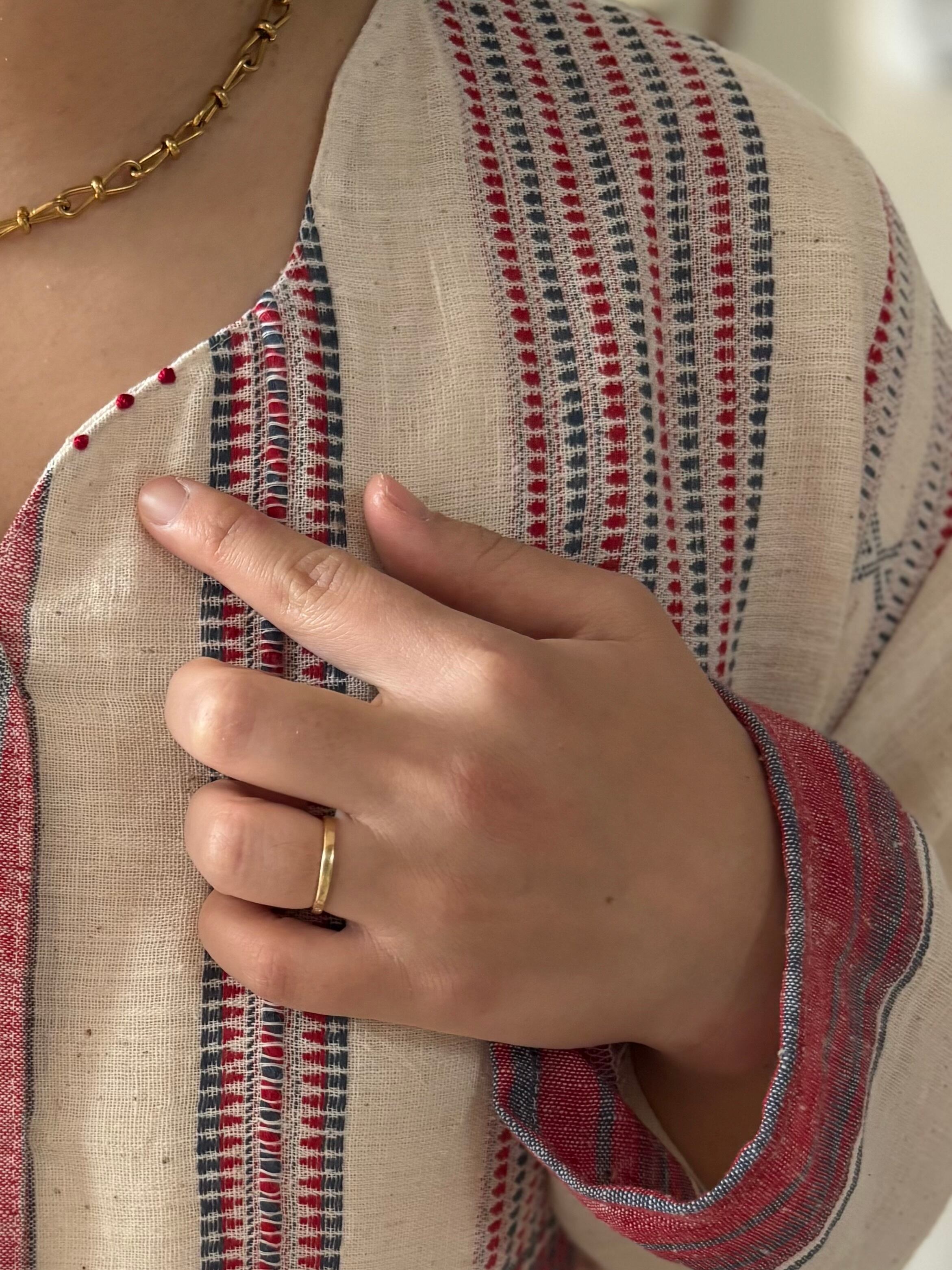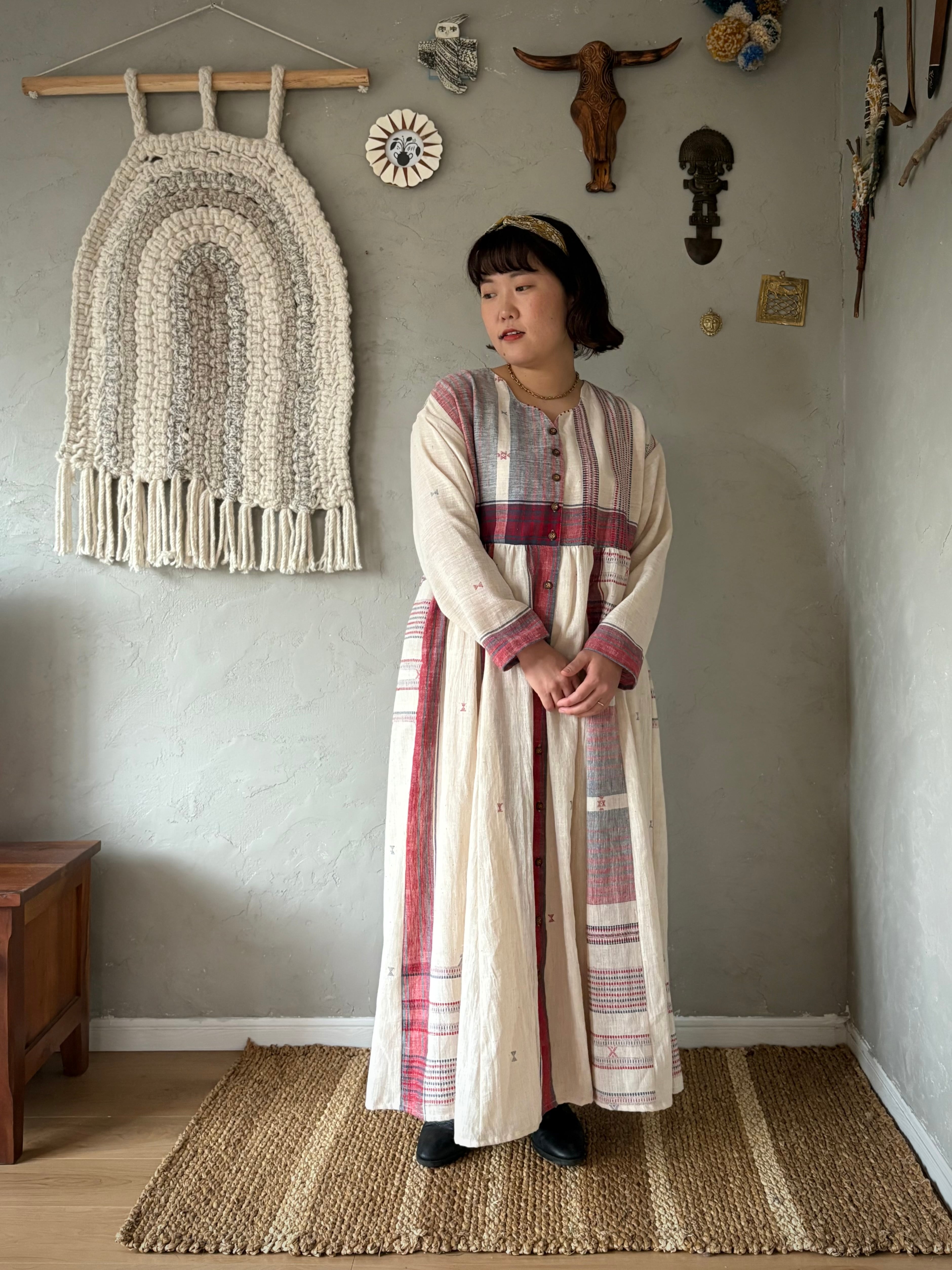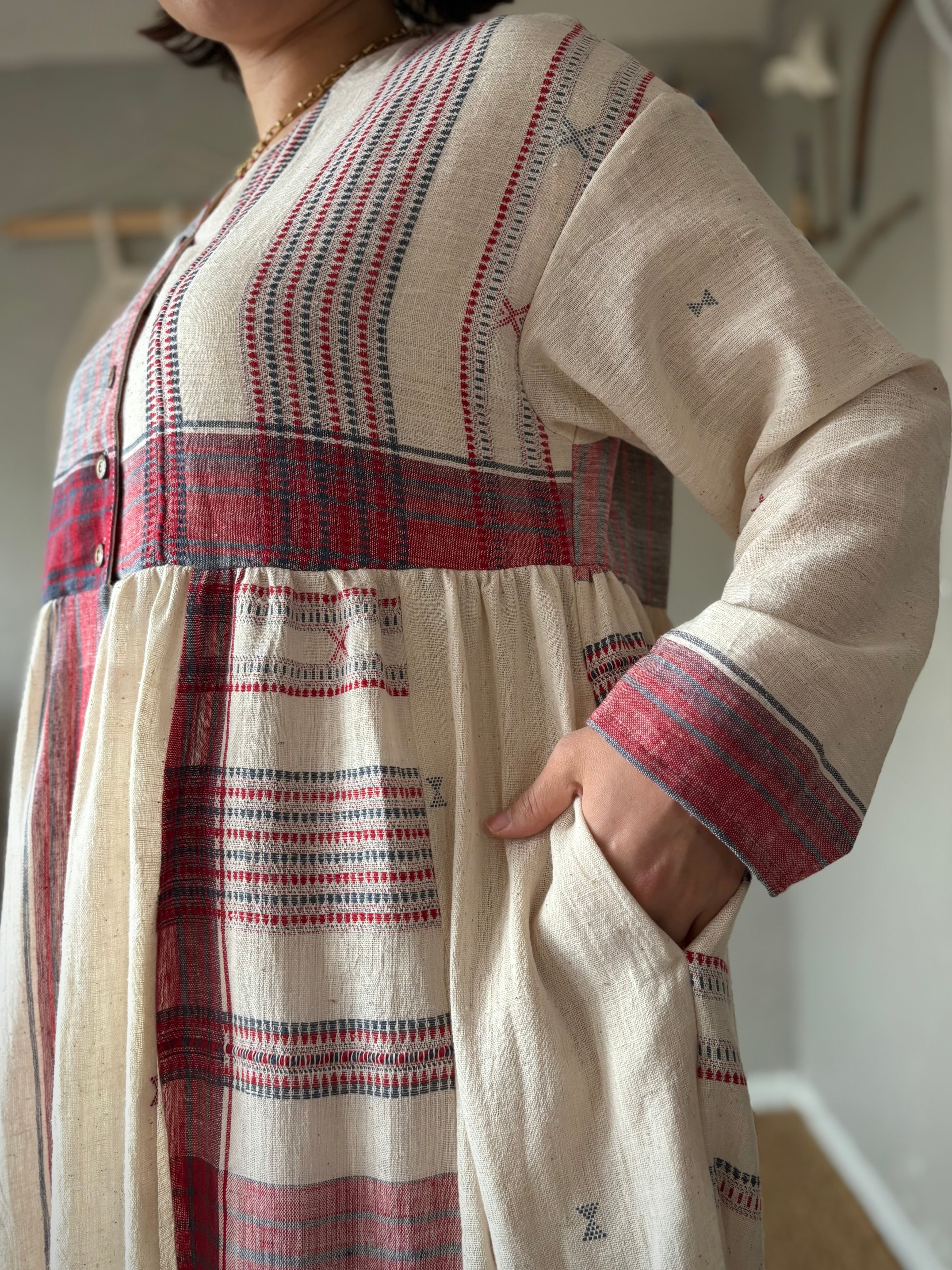 インドの手紡ぎ手織りカラコットンのブジョディサリーを使用。