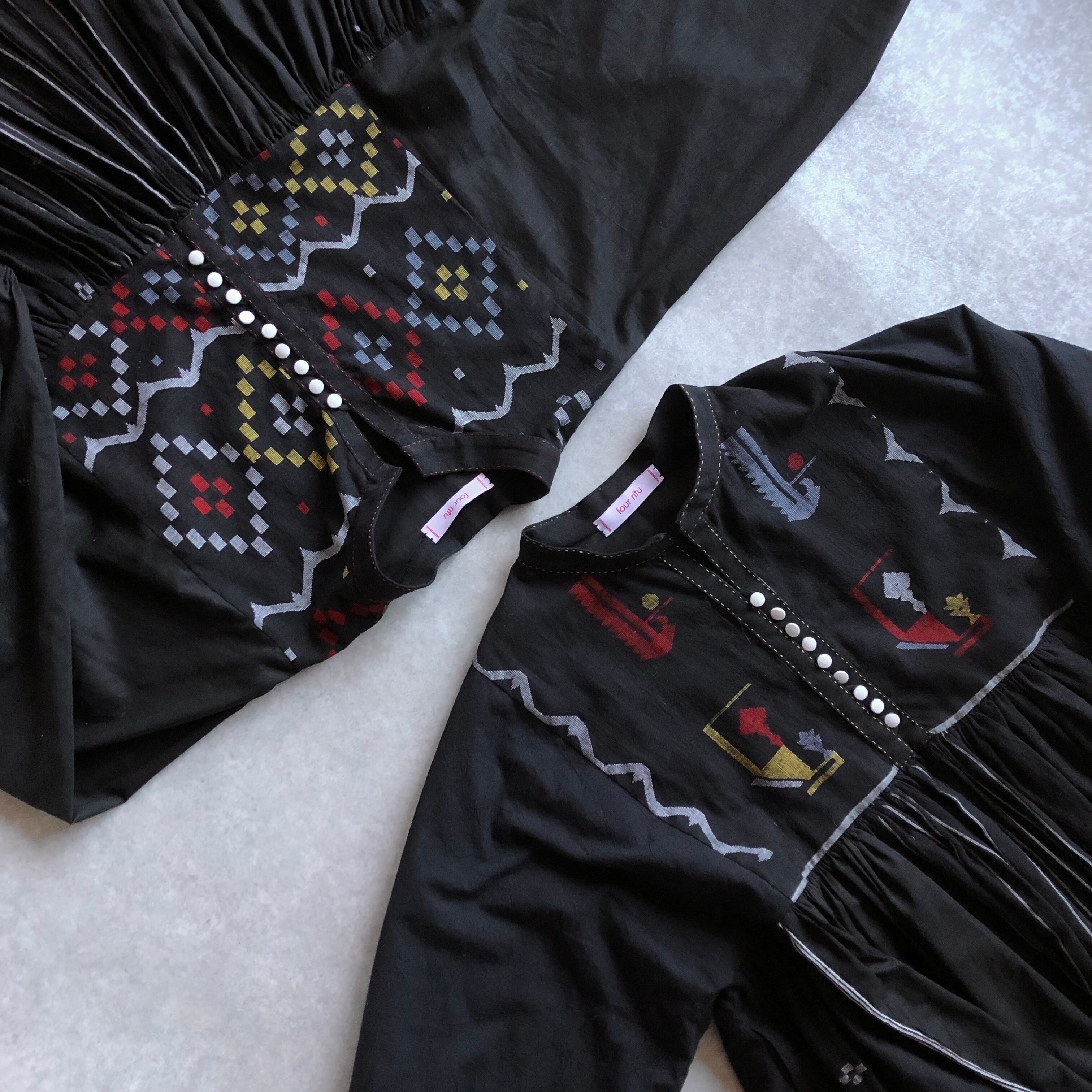 裾と身頃にはジャムダニ織のカラフルな織模様が。