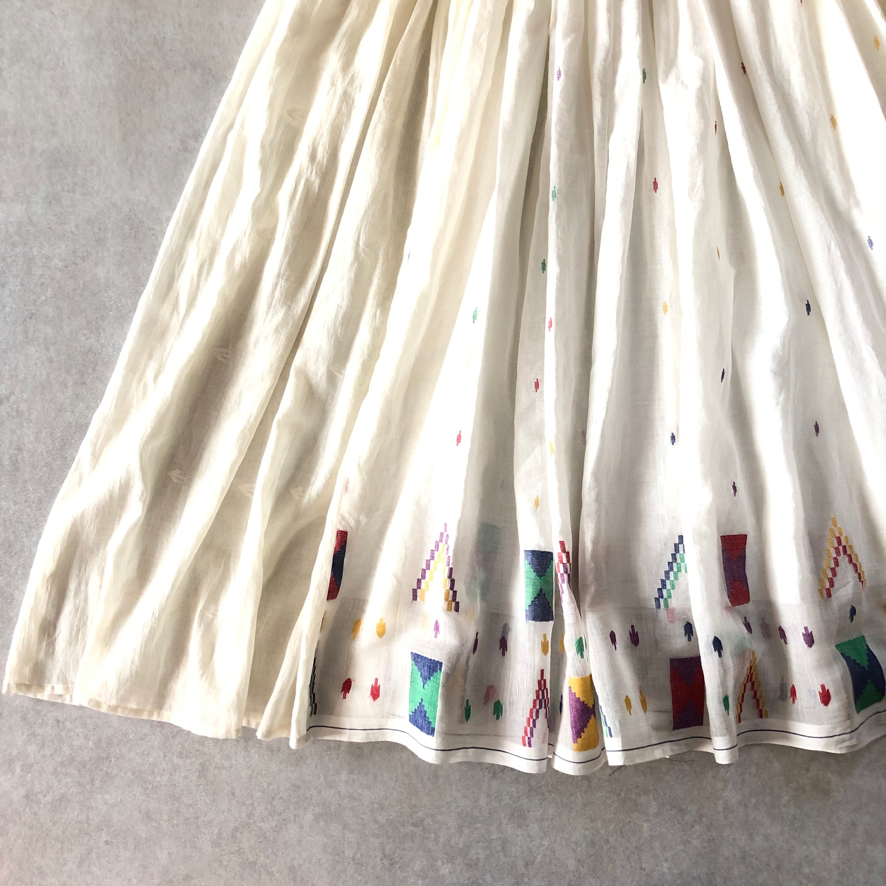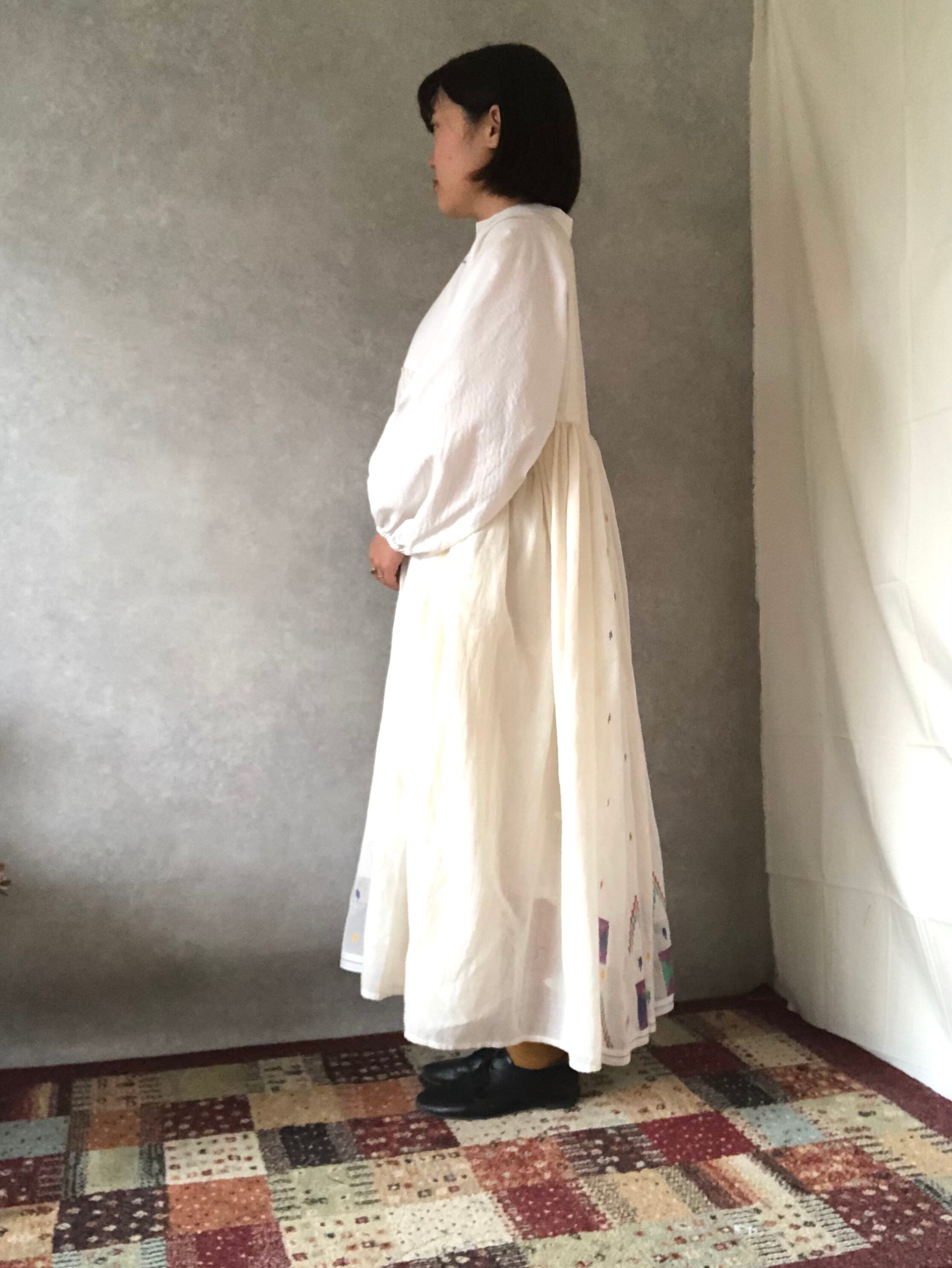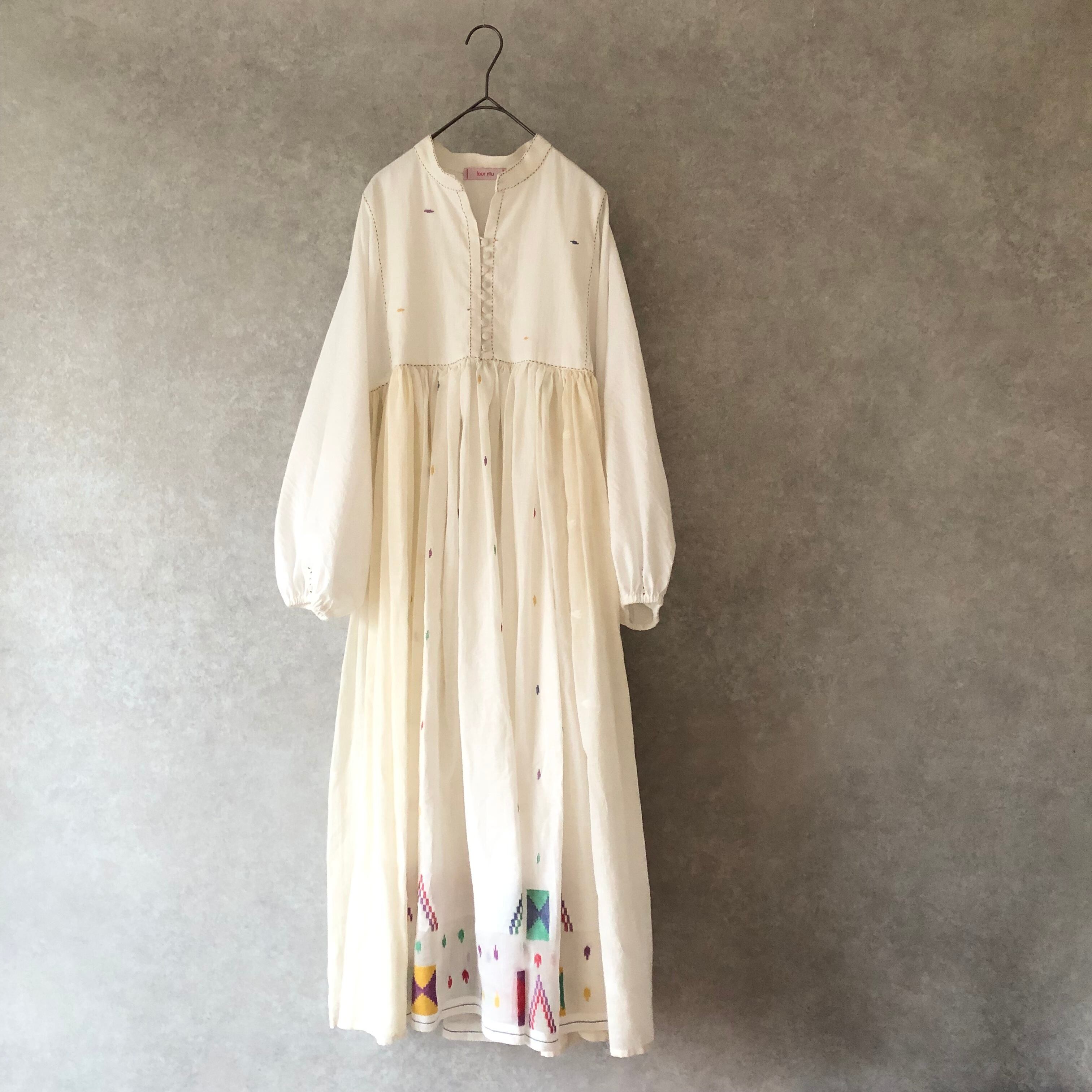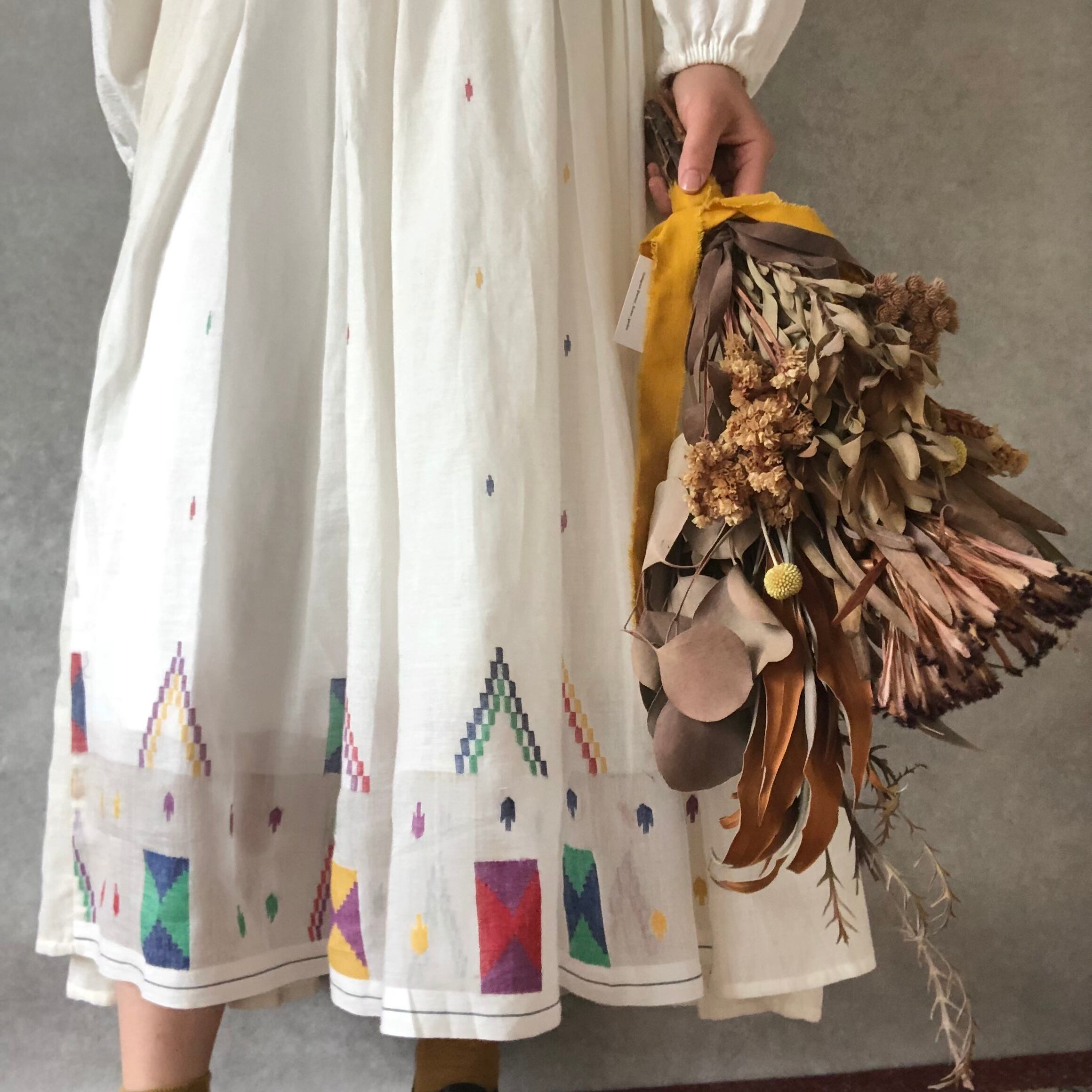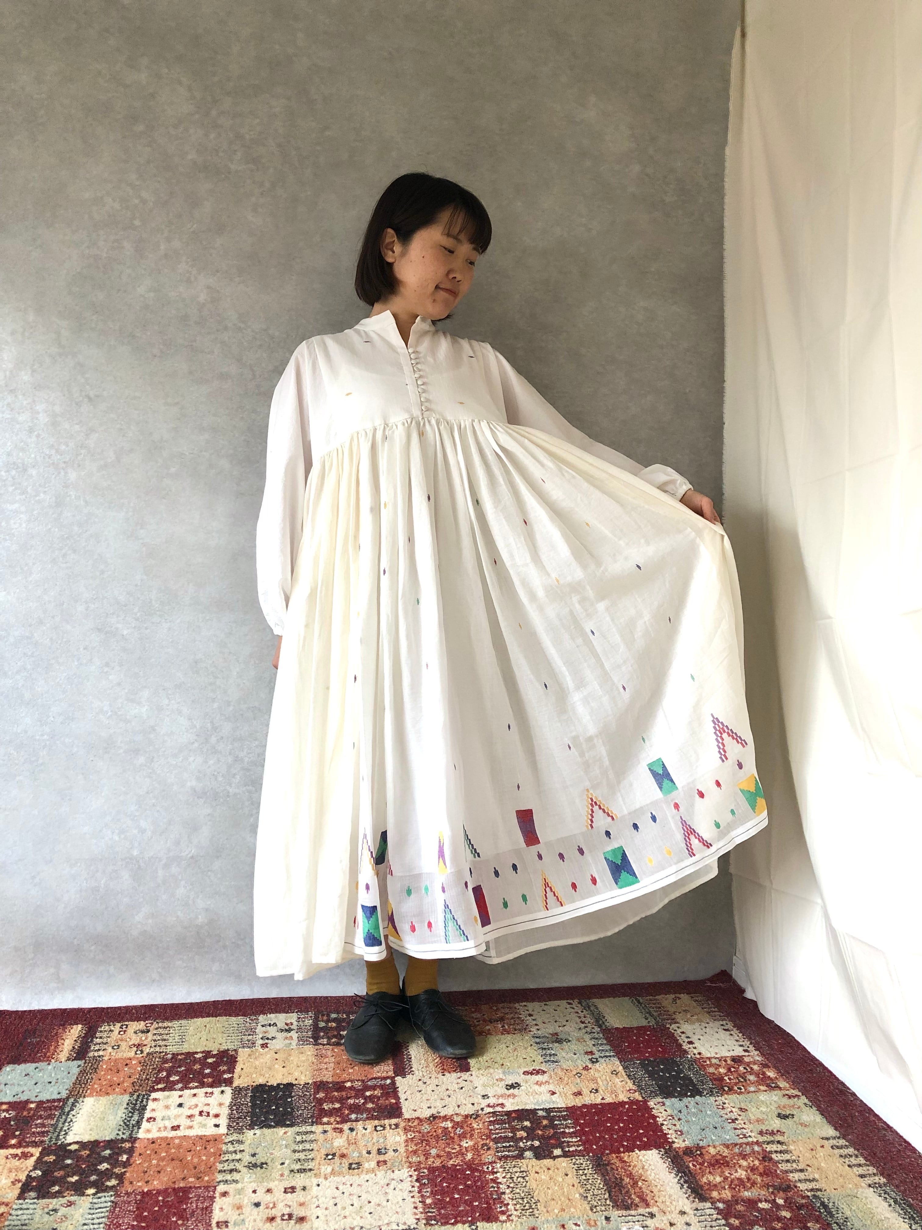 カディコットン素材が肌触り抜群のボタンワンピース。裾のカラフルなジャムダニ織の模様が目を引く一着です。