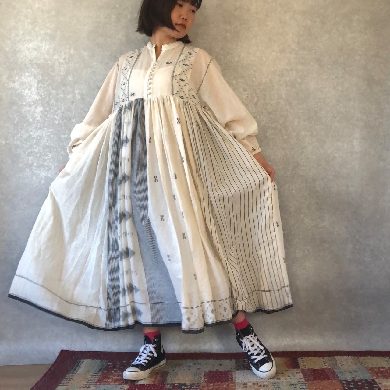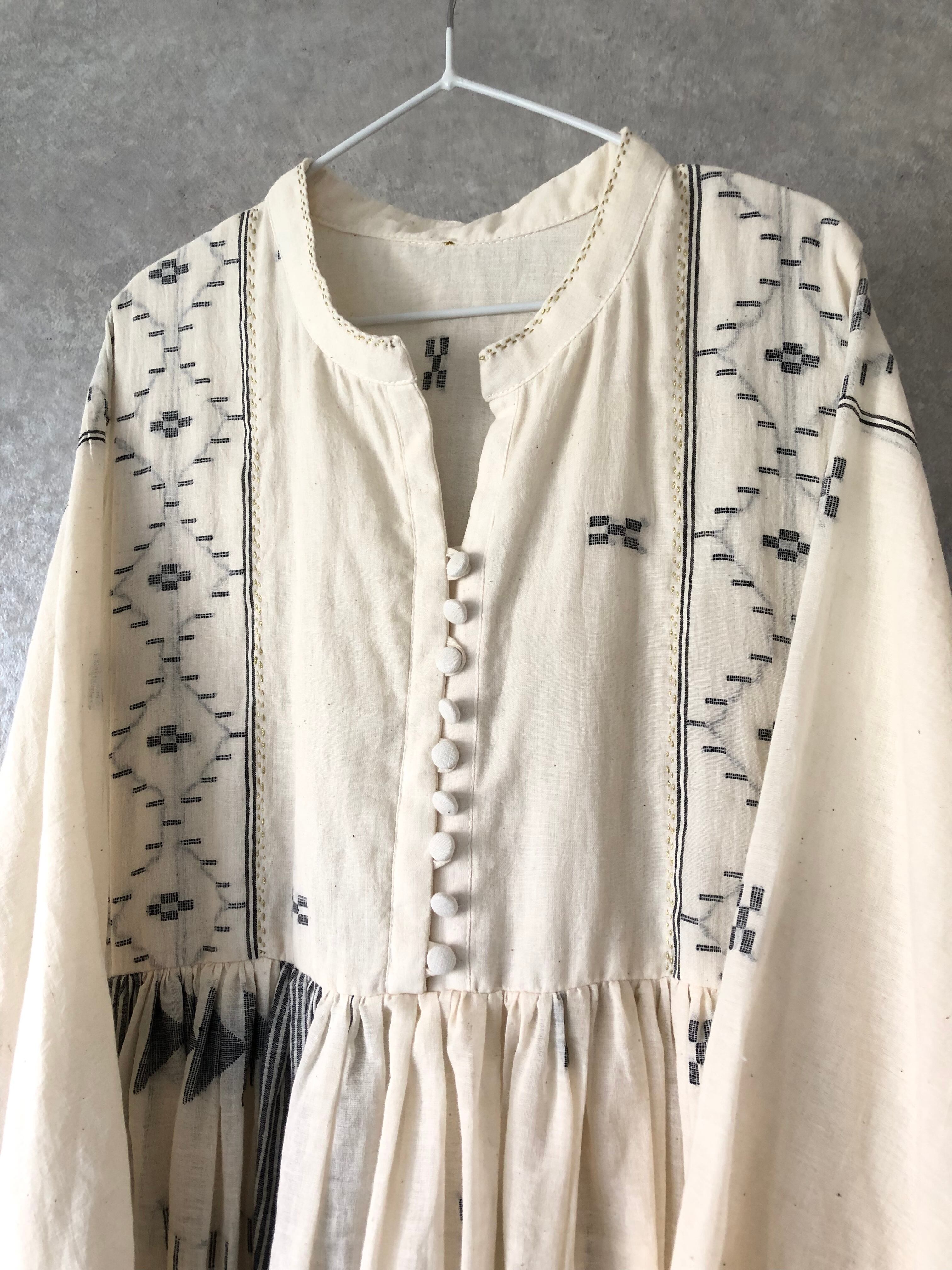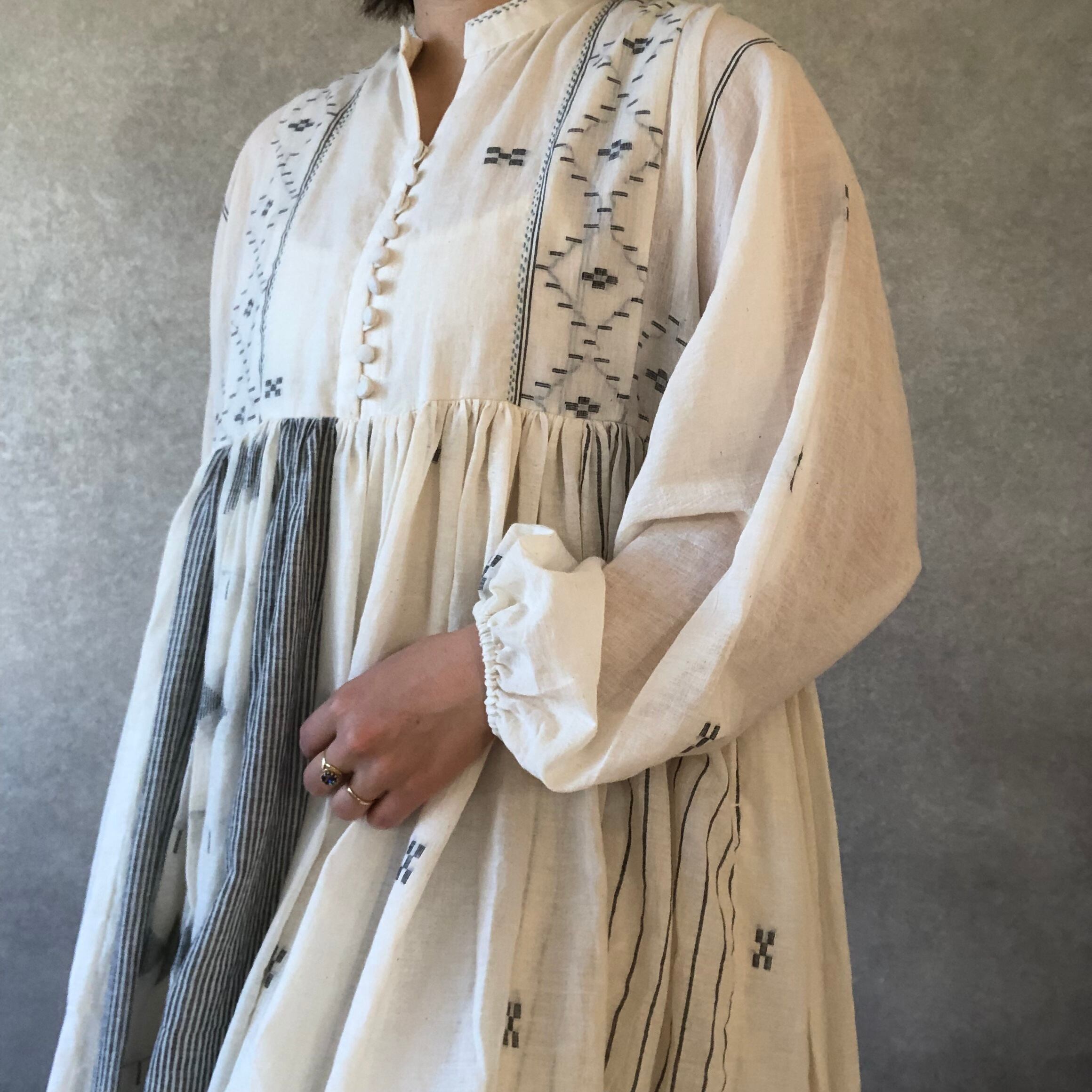 こちらのカディコットンボタンワンピースは、ナチュラルな風合いと個性的なジャムダニ織の模様が特徴です。6.5mの長さのサリーを1枚丸ごと使ってこの1着のワンピースを作りました。カディコットン100%素材で柔らかく、肌触りも抜群。