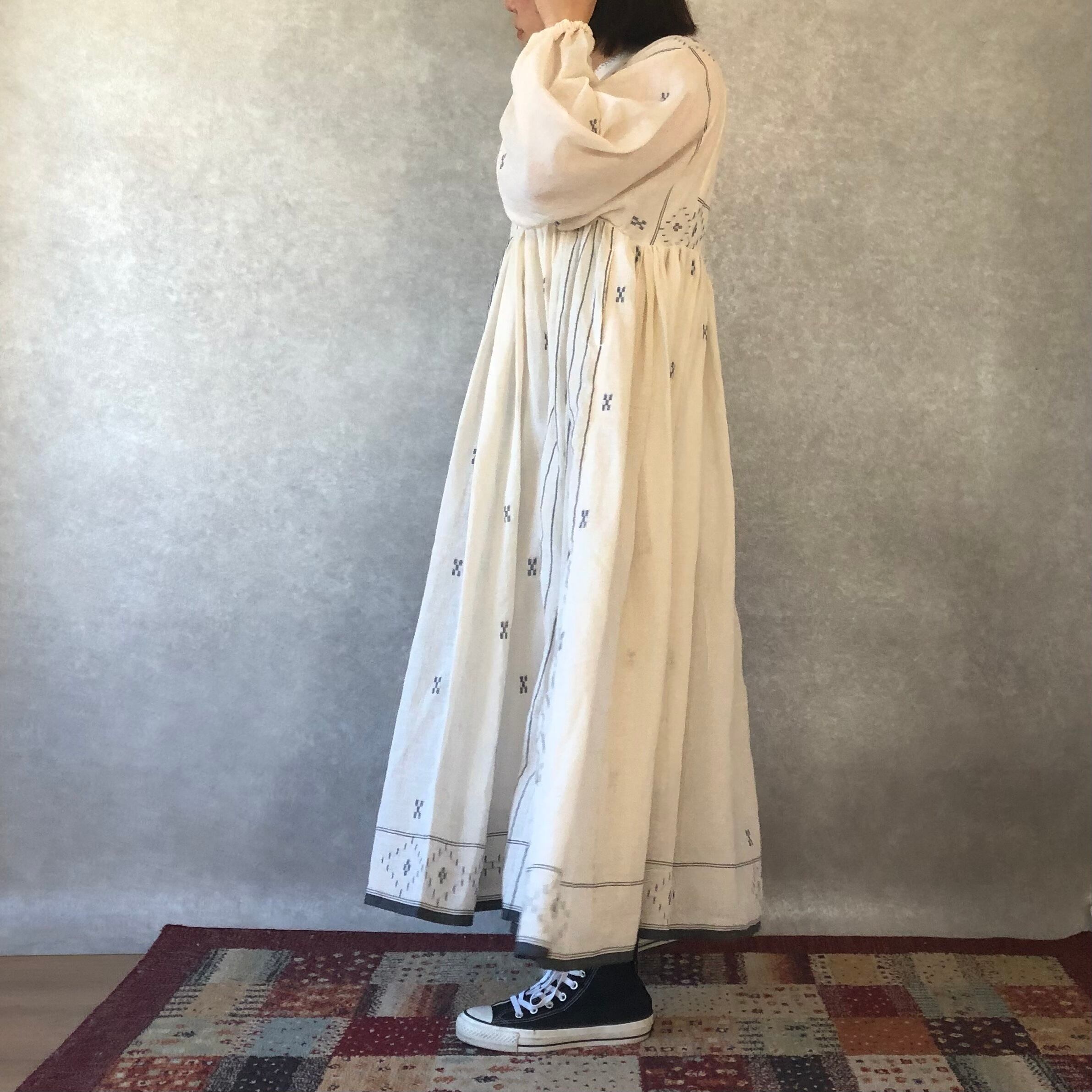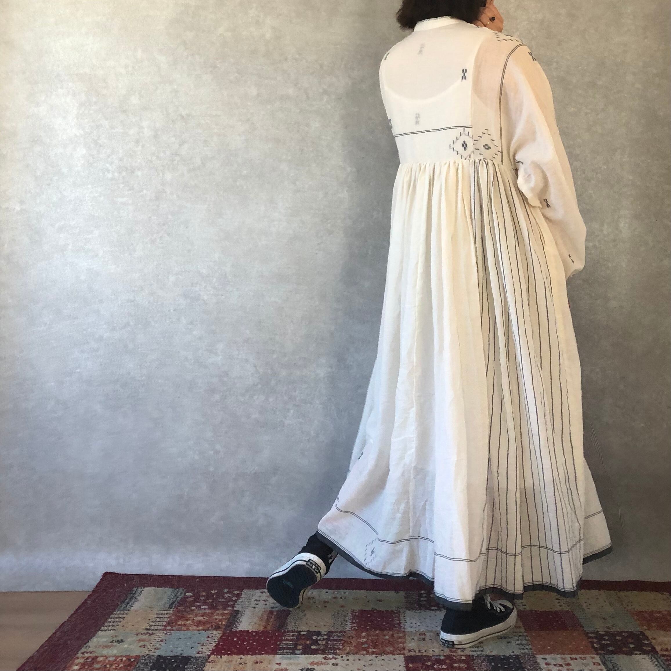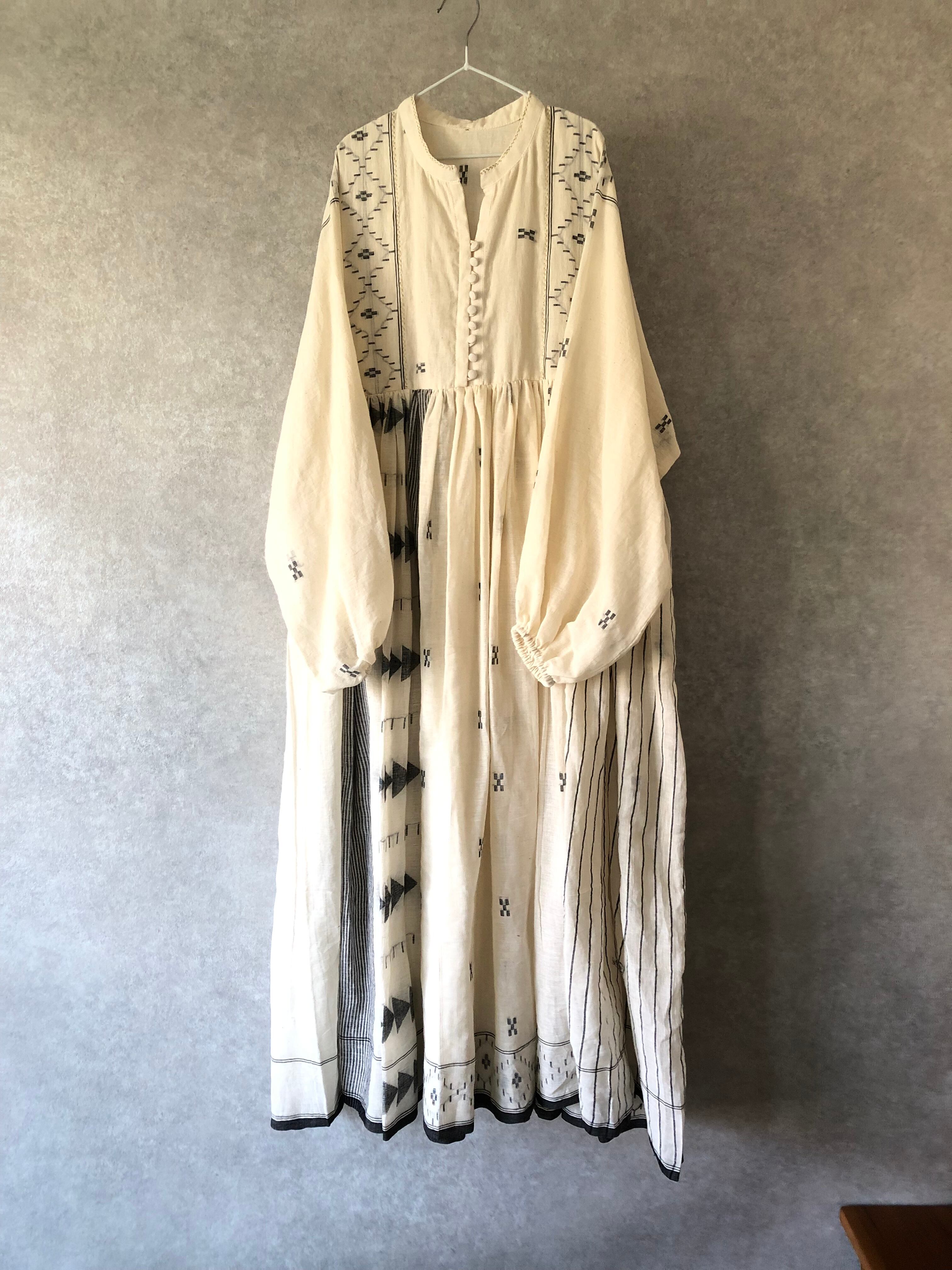 こちらのカディコットンボタンワンピースは、ナチュラルな風合いと個性的なジャムダニ織の模様が特徴です。6.5mの長さのサリーを1枚丸ごと使ってこの1着のワンピースを作りました。カディコットン100%素材で柔らかく、肌触りも抜群。
