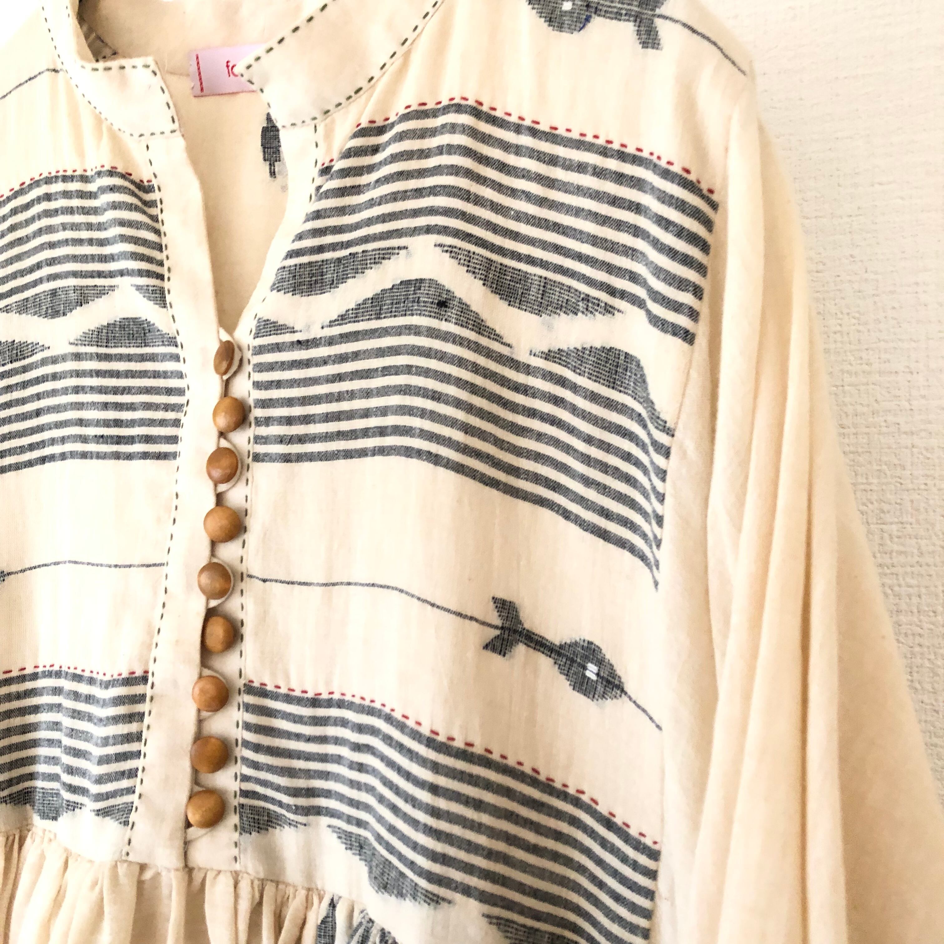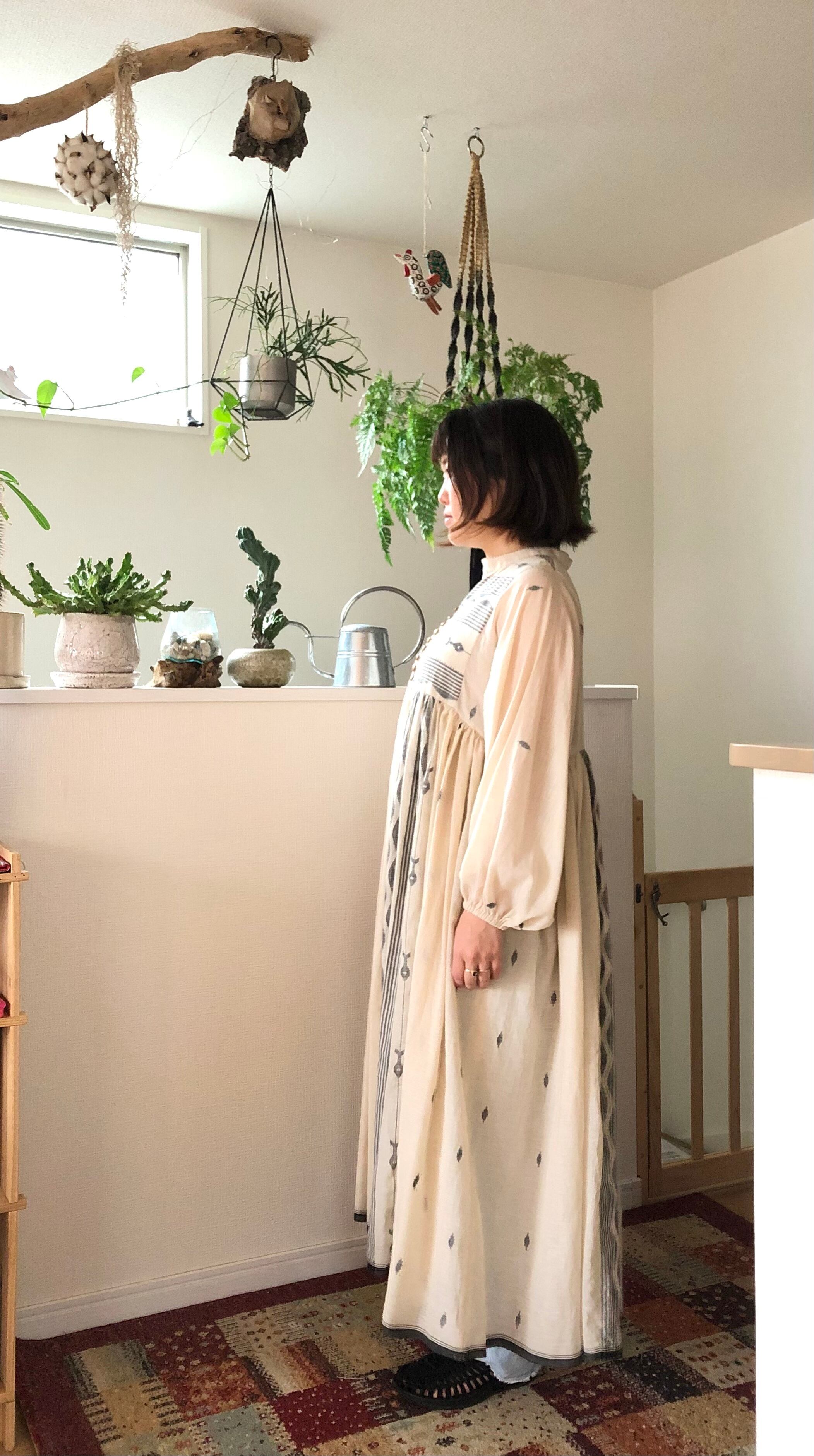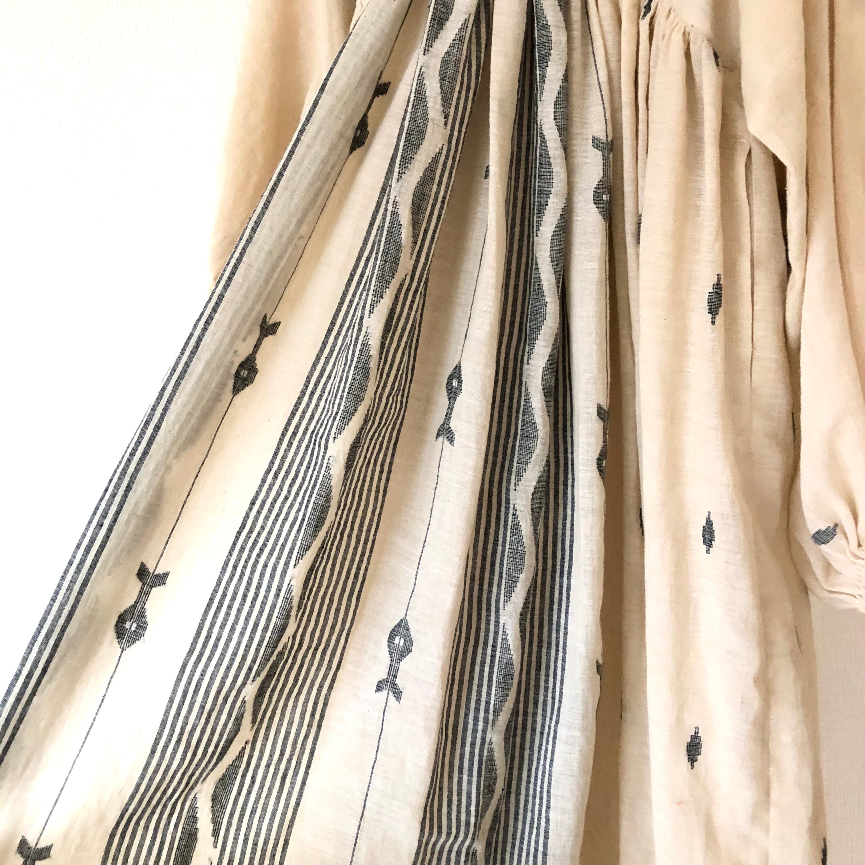大胆なジャムダニ織の柄が身頃、スカートに施されていますが、