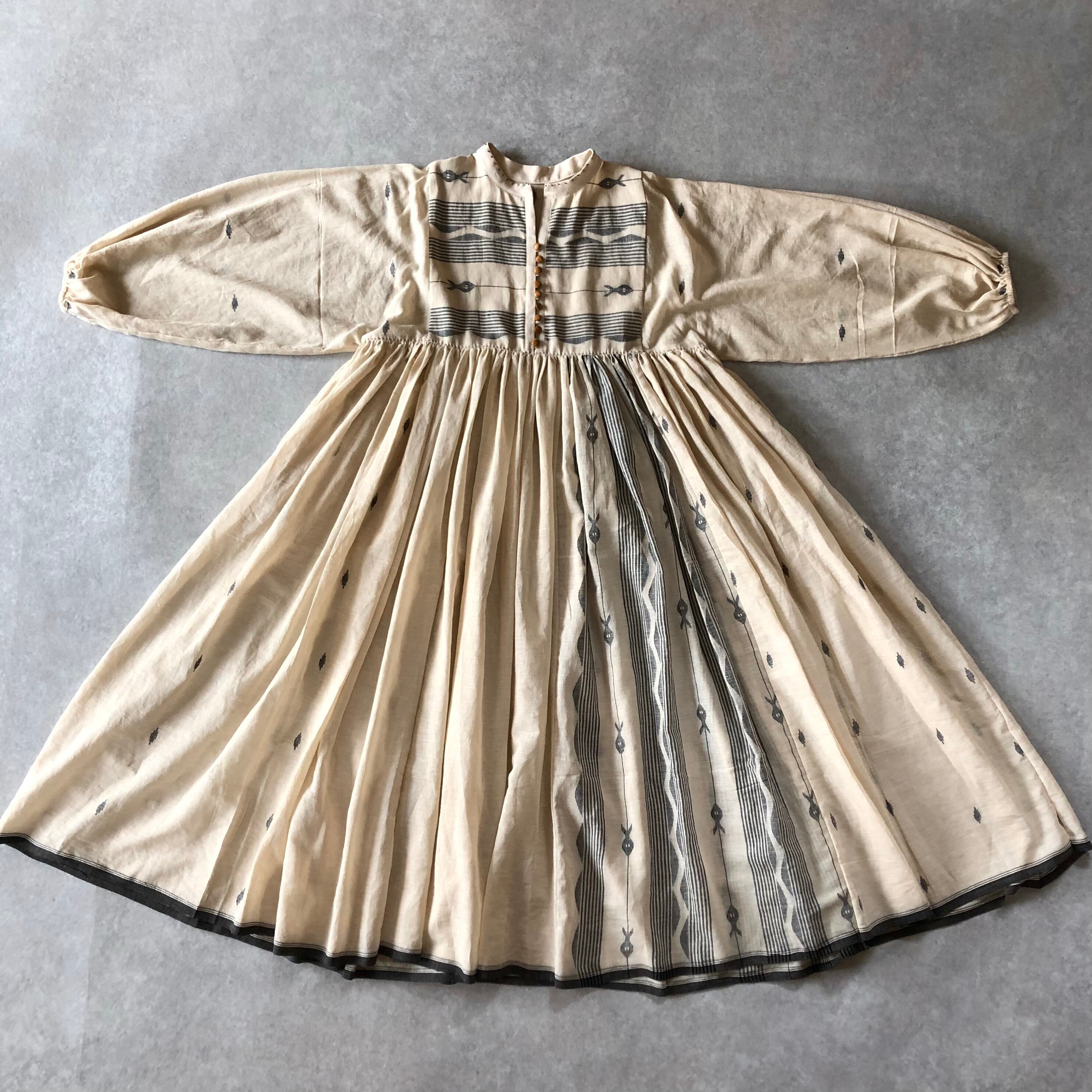 大胆なジャムダニ織の柄が身頃、スカートに施されていますが、