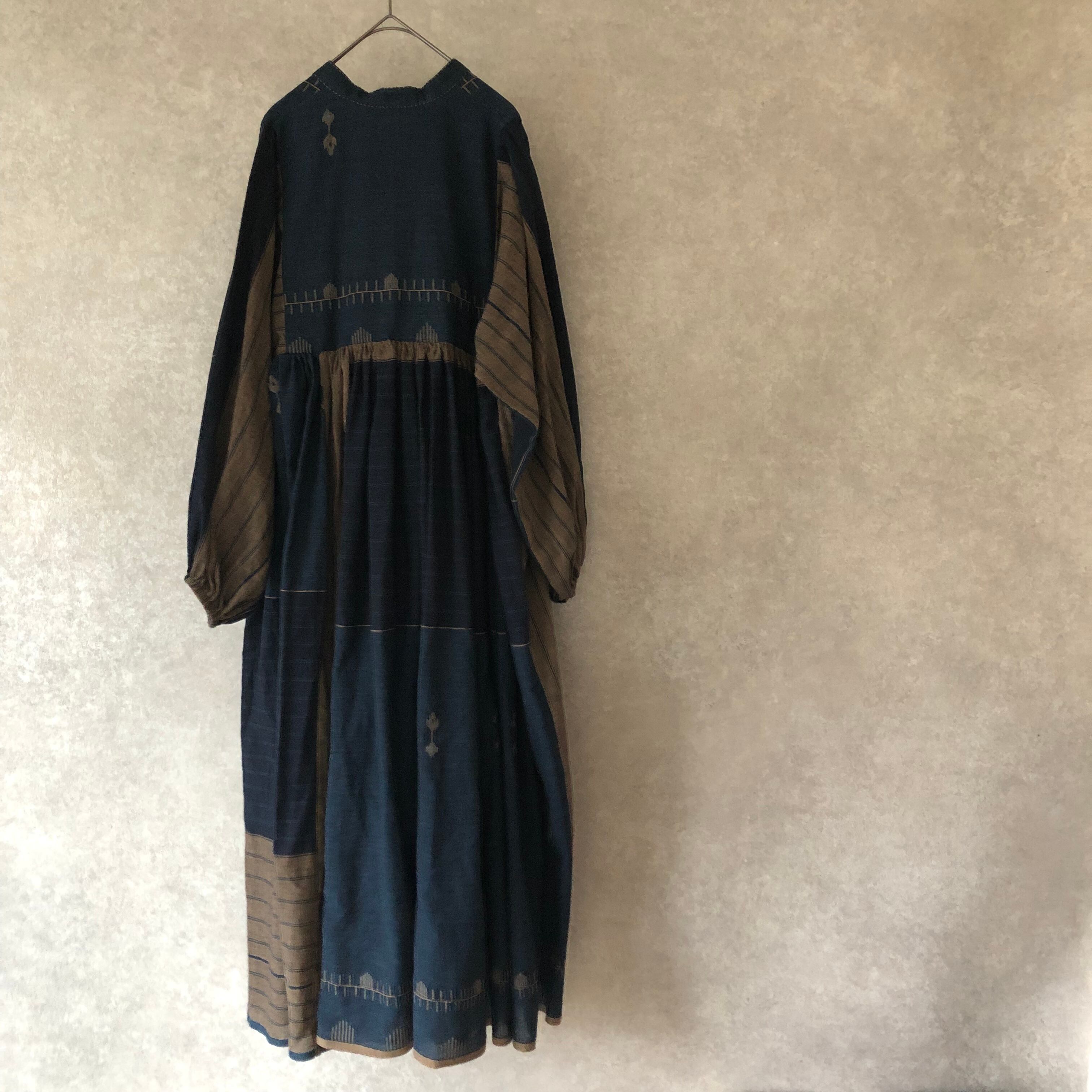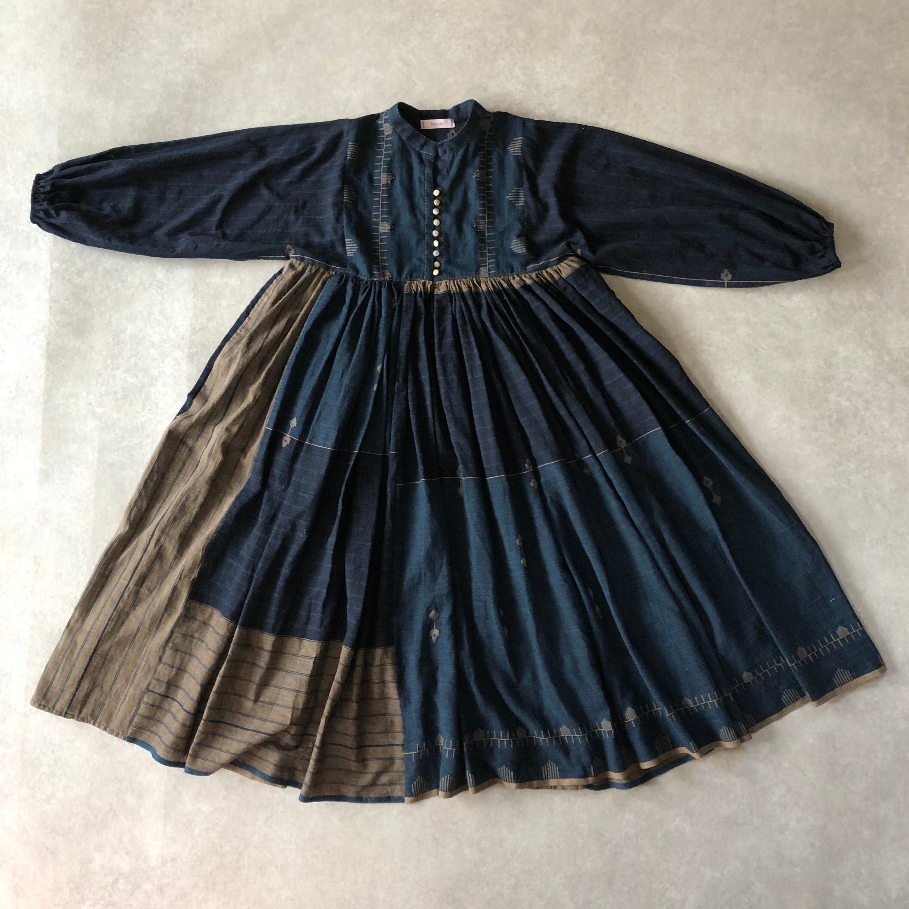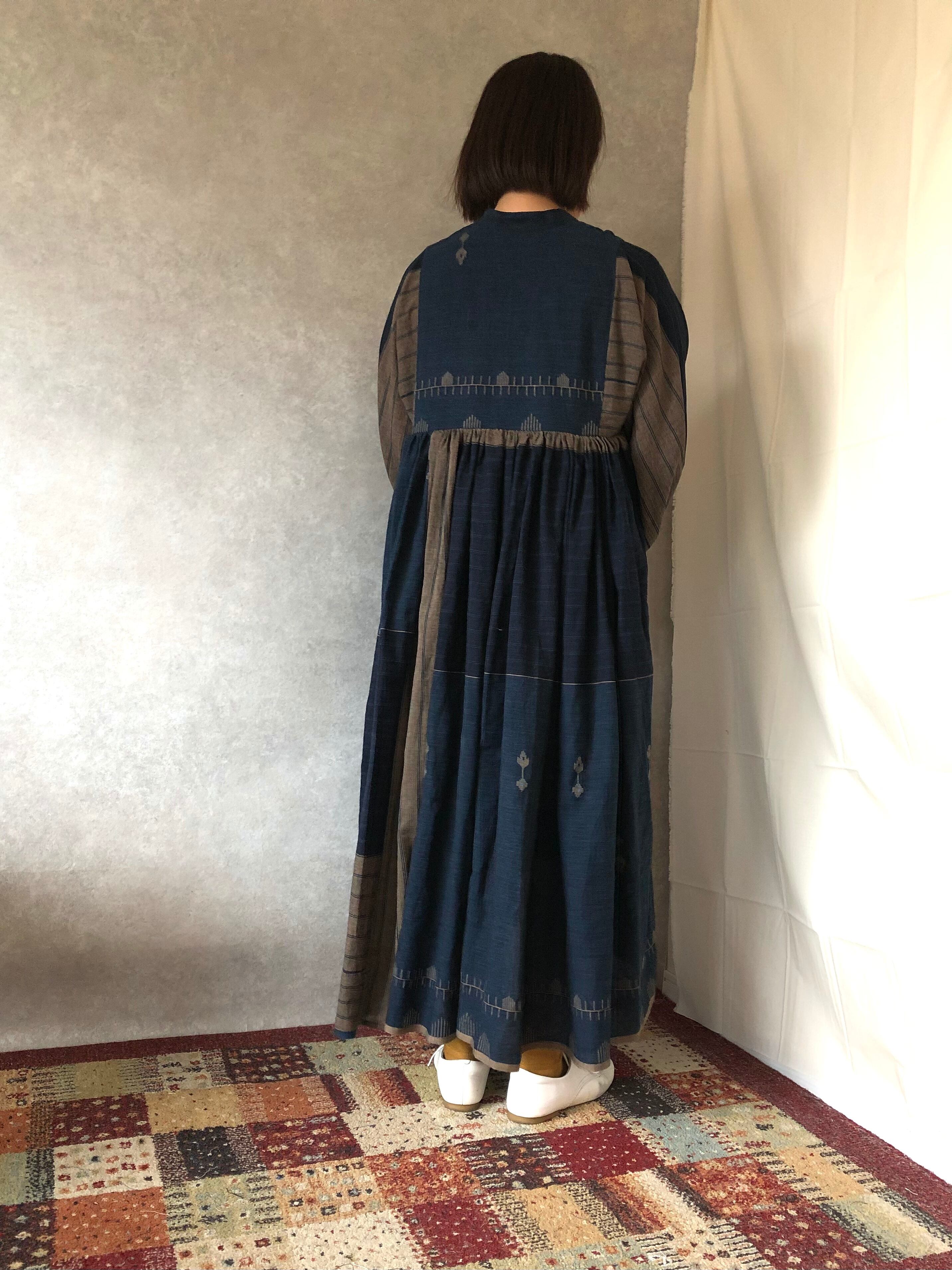 色んな色柄で構成されているカディを、細かい裁断図を作成し、こうして1着のワンピースに仕立てました。仕上げにマスタード色の糸でハンドステッチを施しました。