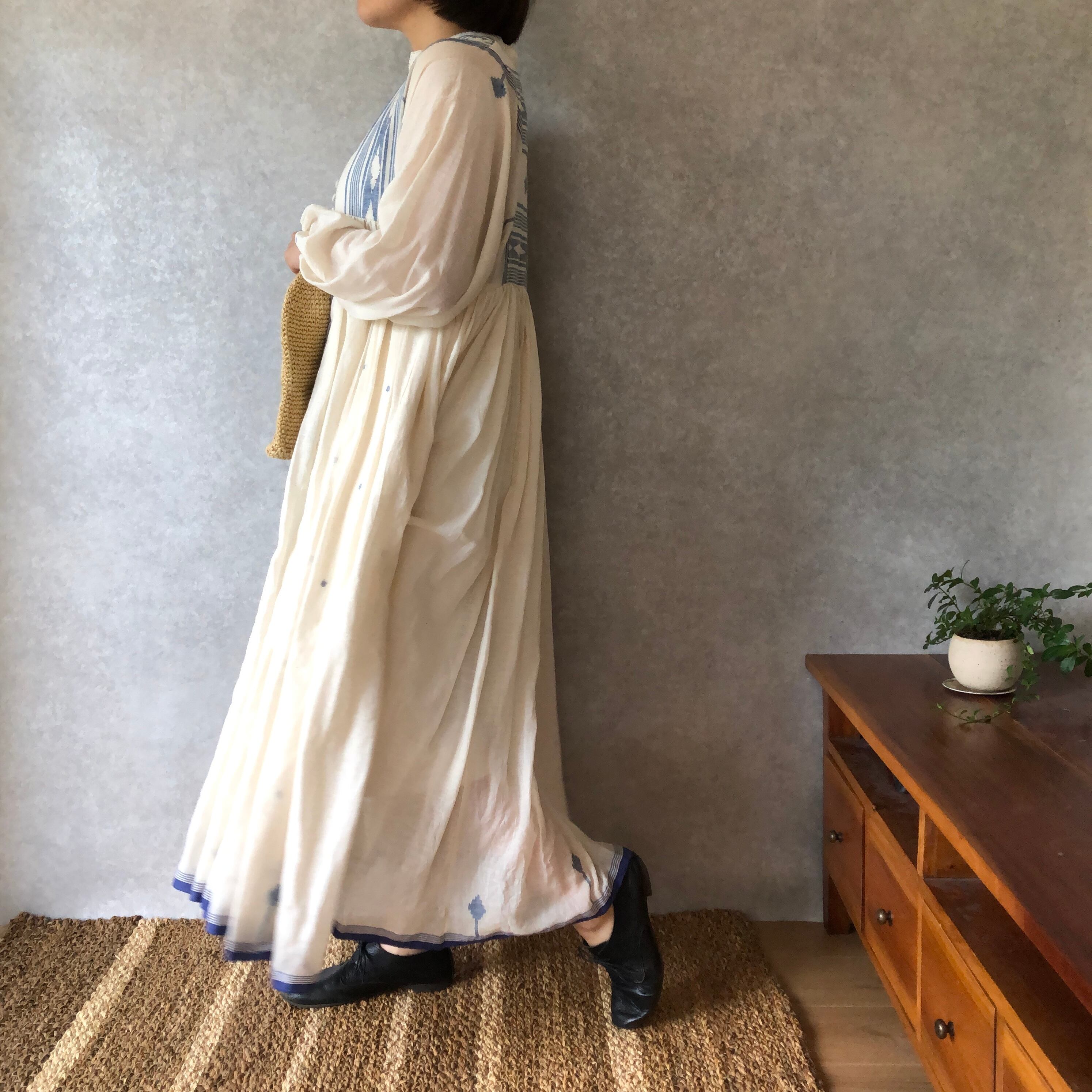 大胆なジャムダニ織の柄が身頃、スカートに施されていますが、