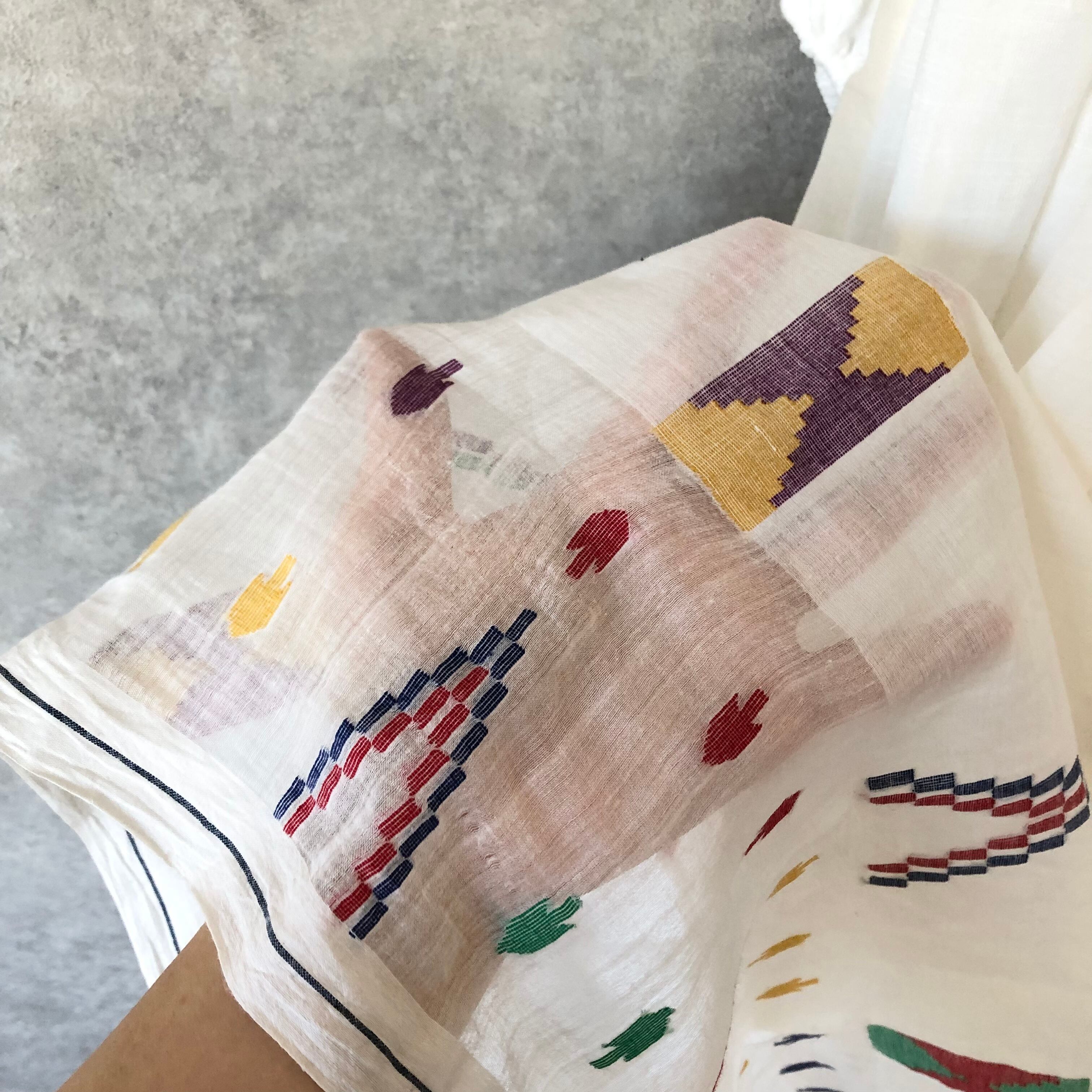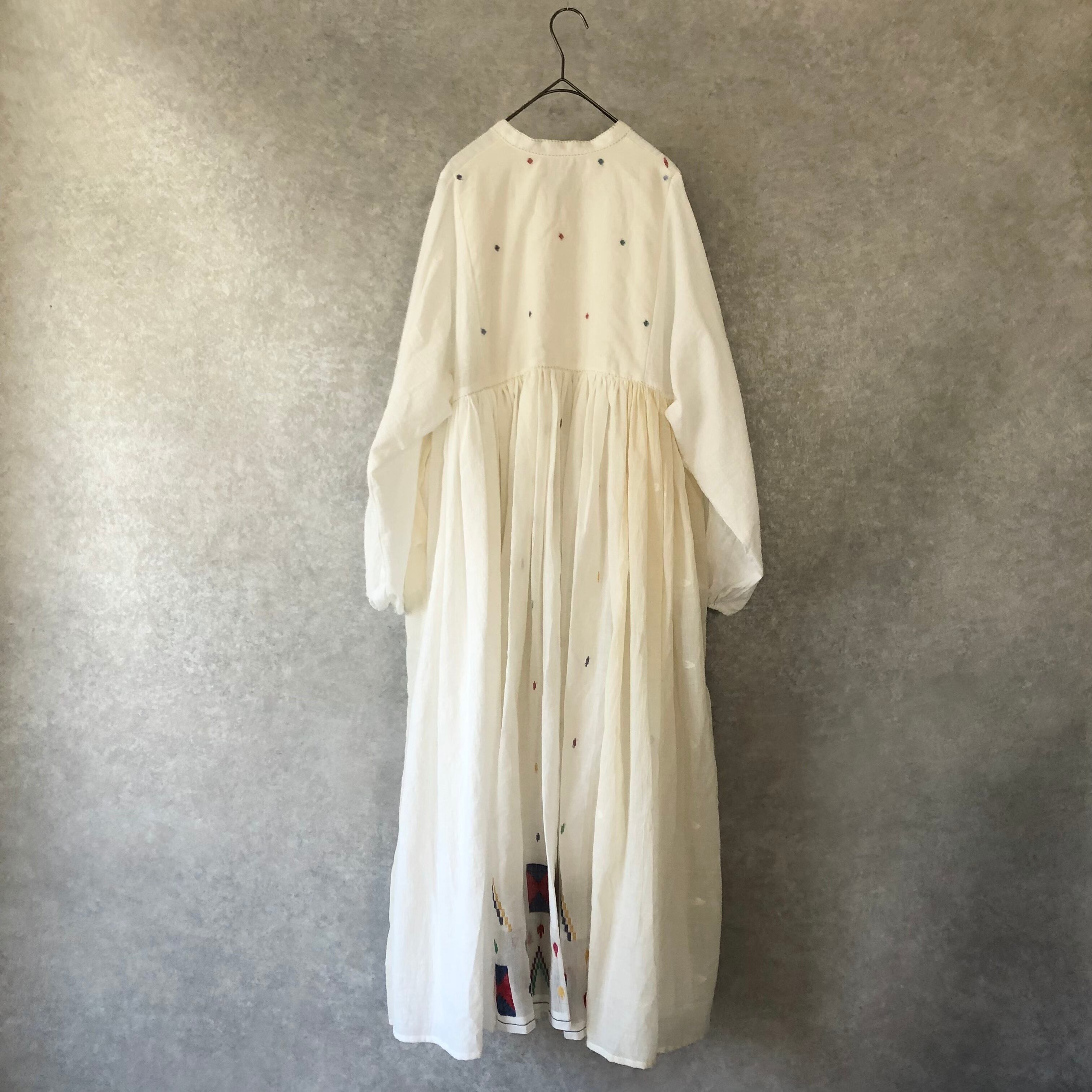こちらは透け感が魅力的なカディコットンワンピースです。裾にはカラフルなジャムダニ織りが施され、軽やかな着心地で爽やかさを演出します。