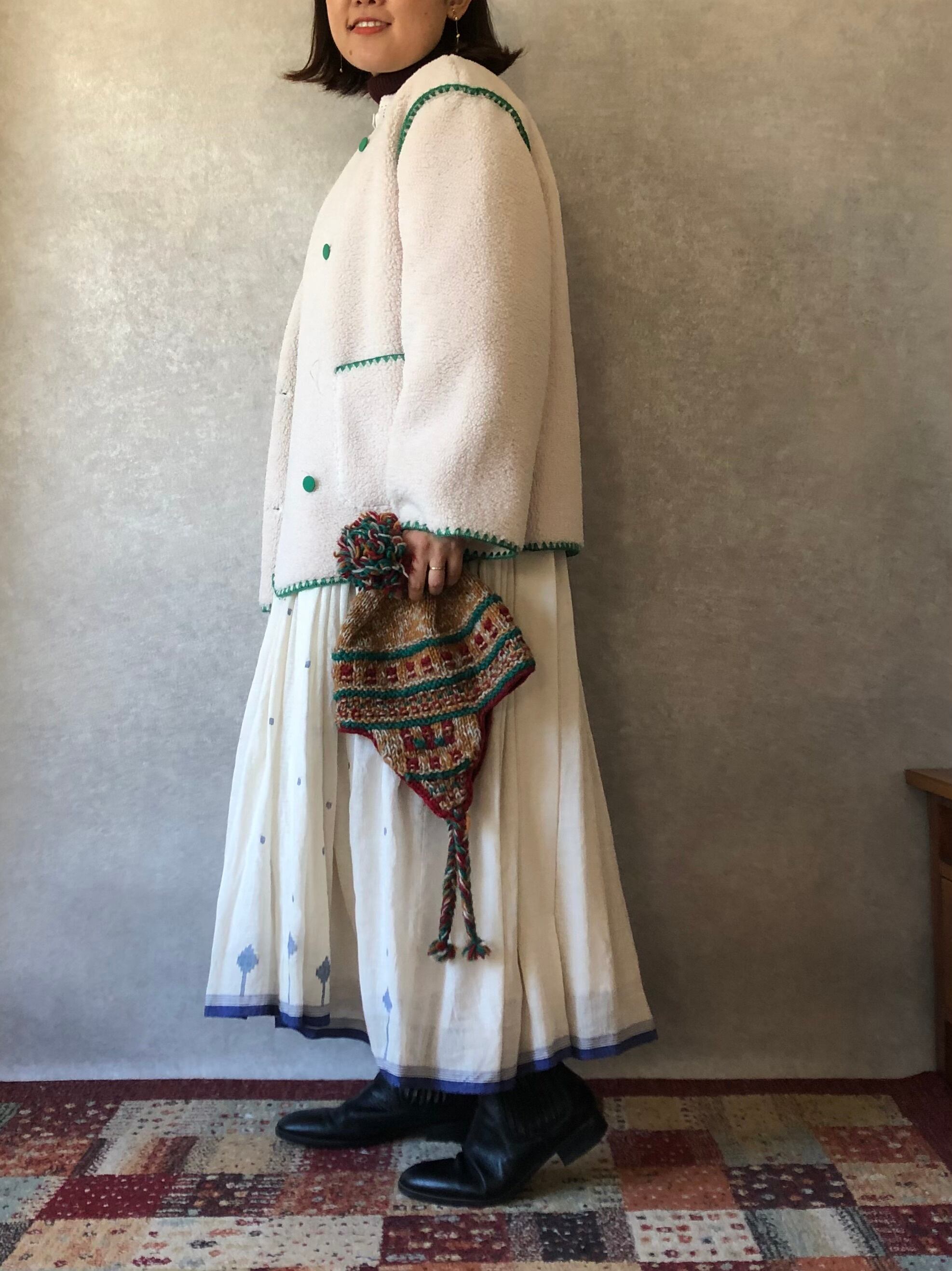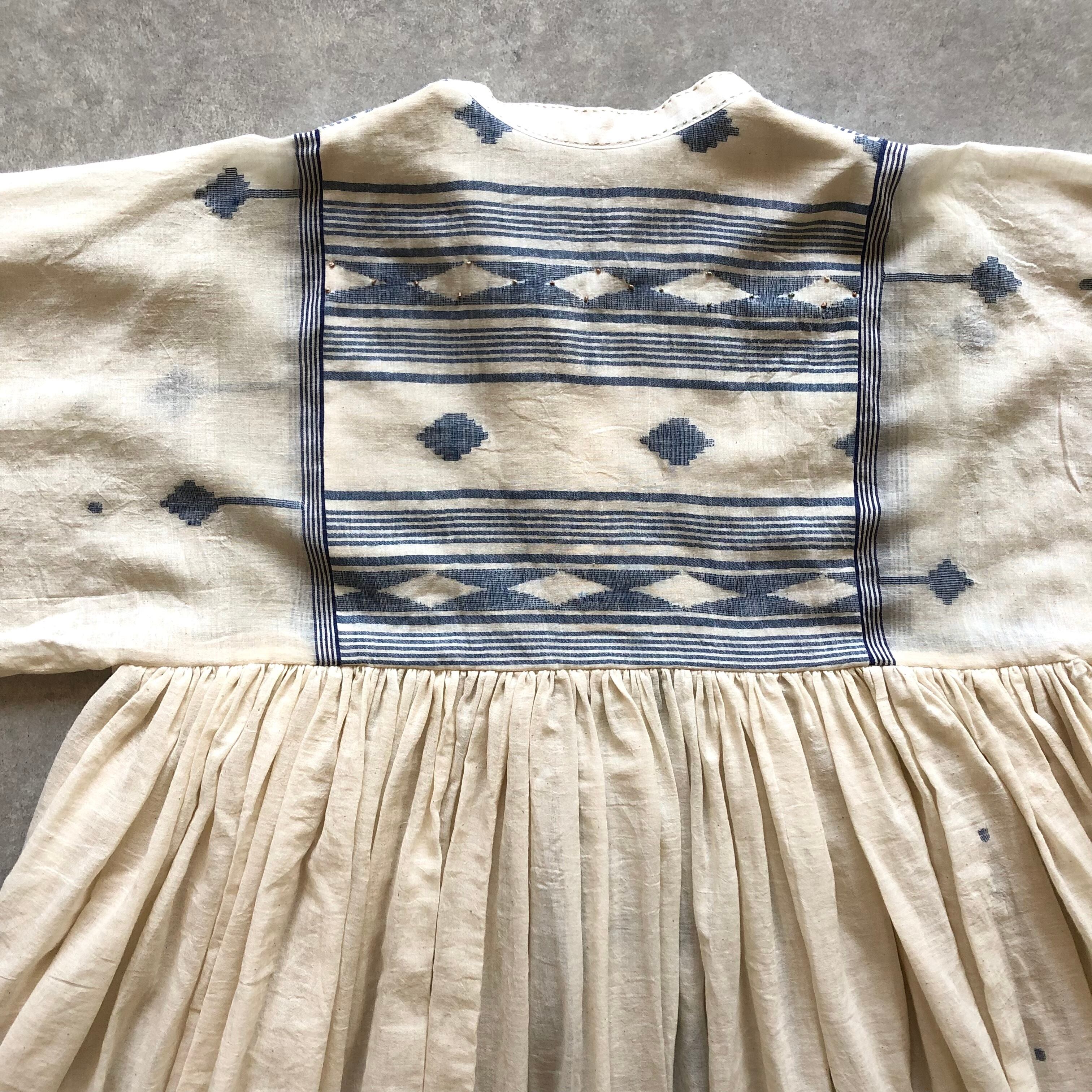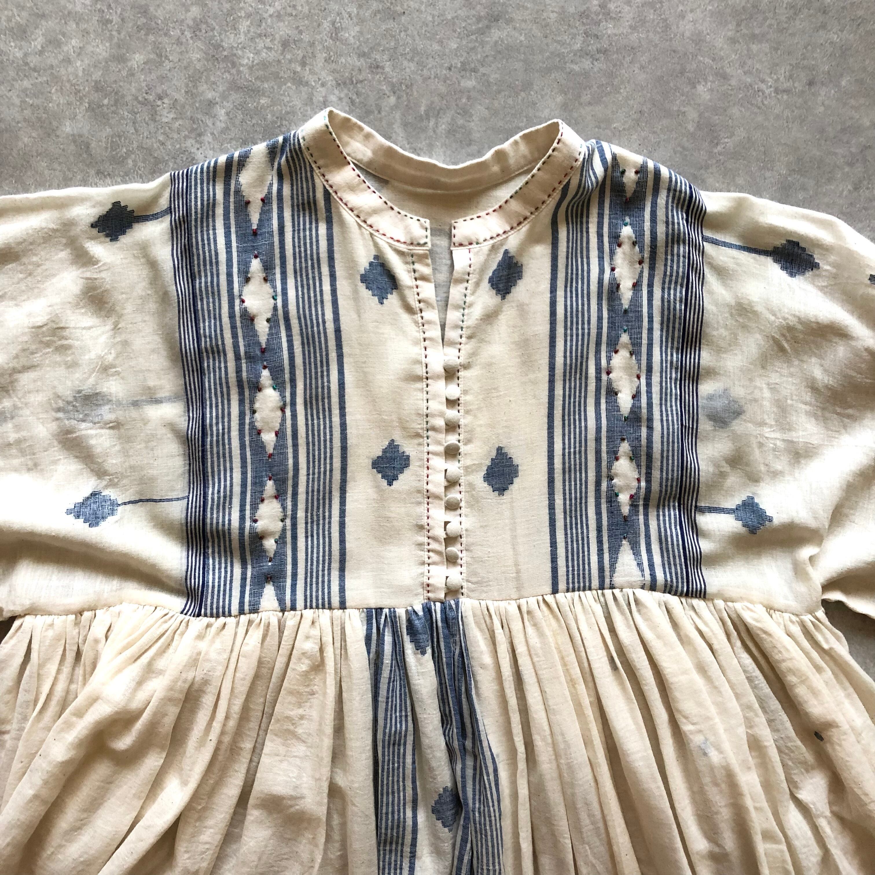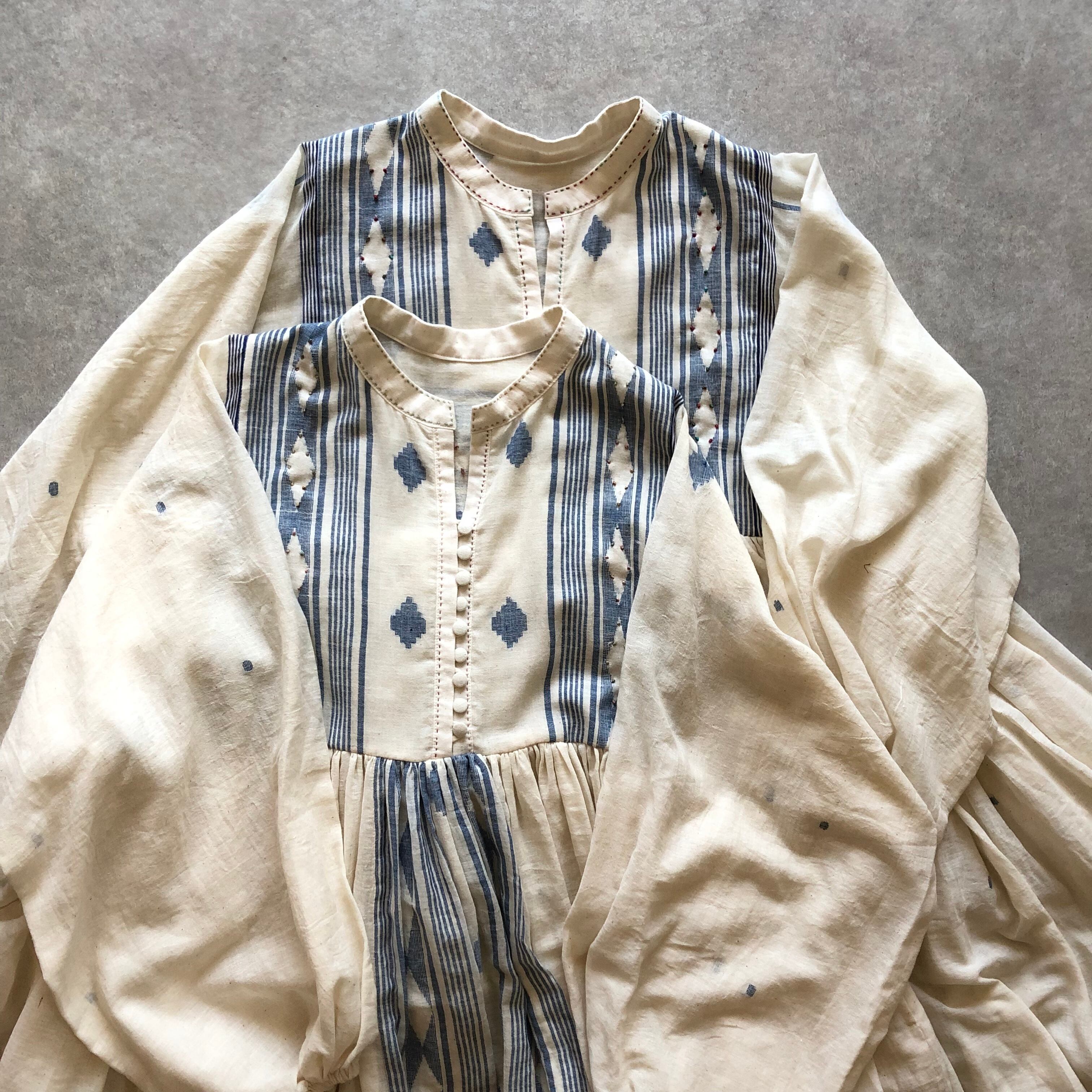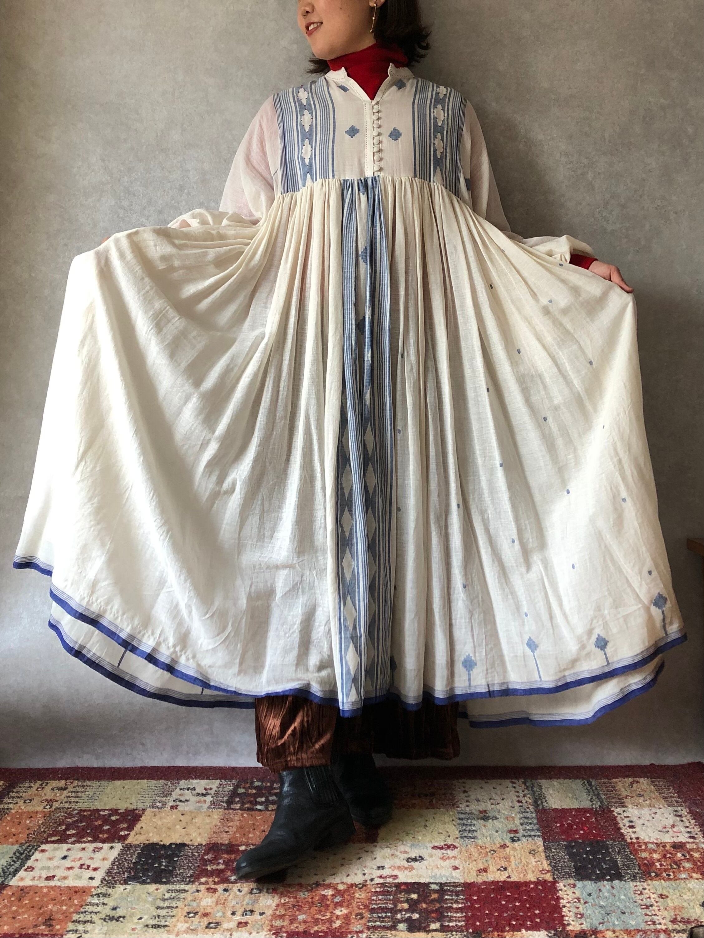 大胆なジャムダニ織の柄が身頃、スカートに施されていますが、