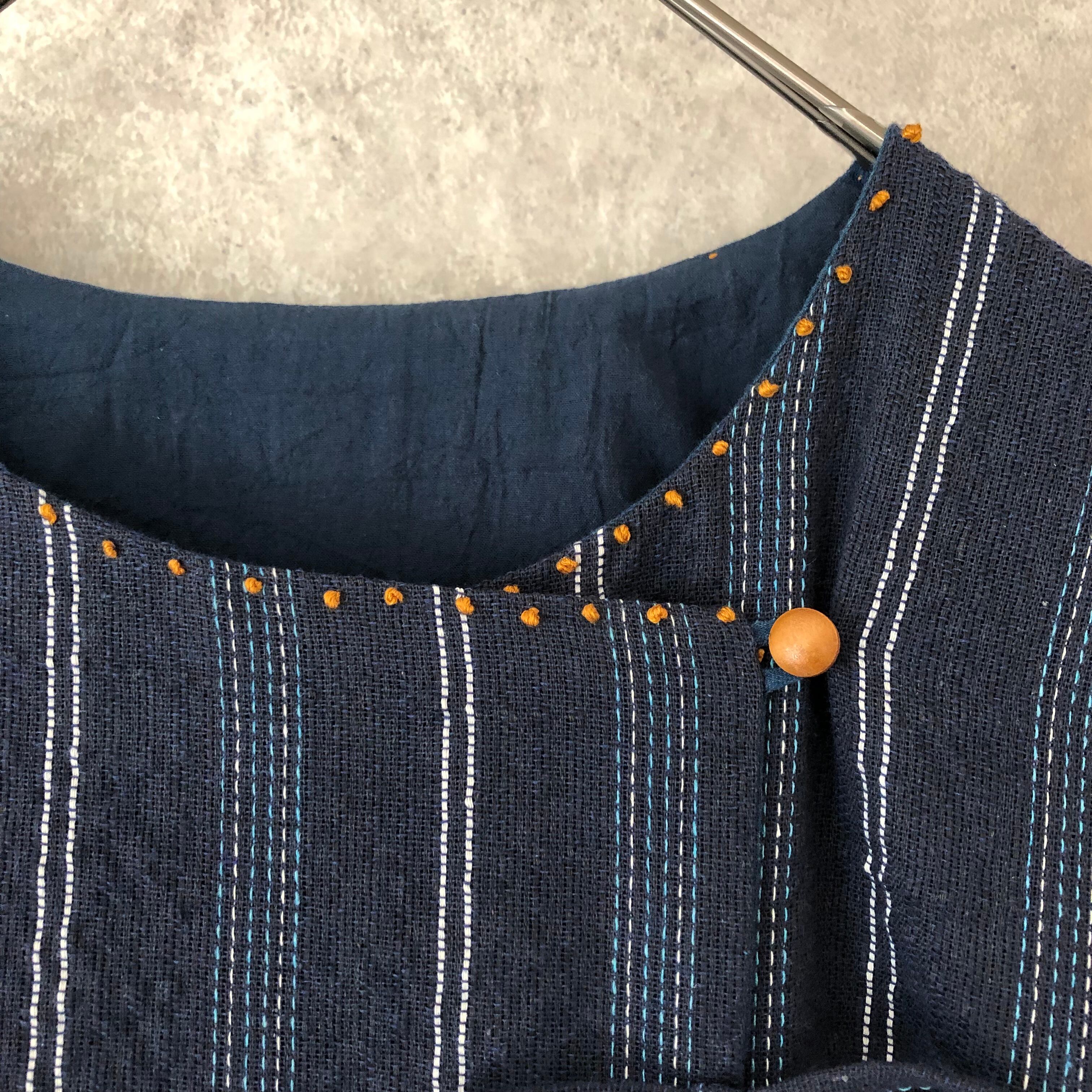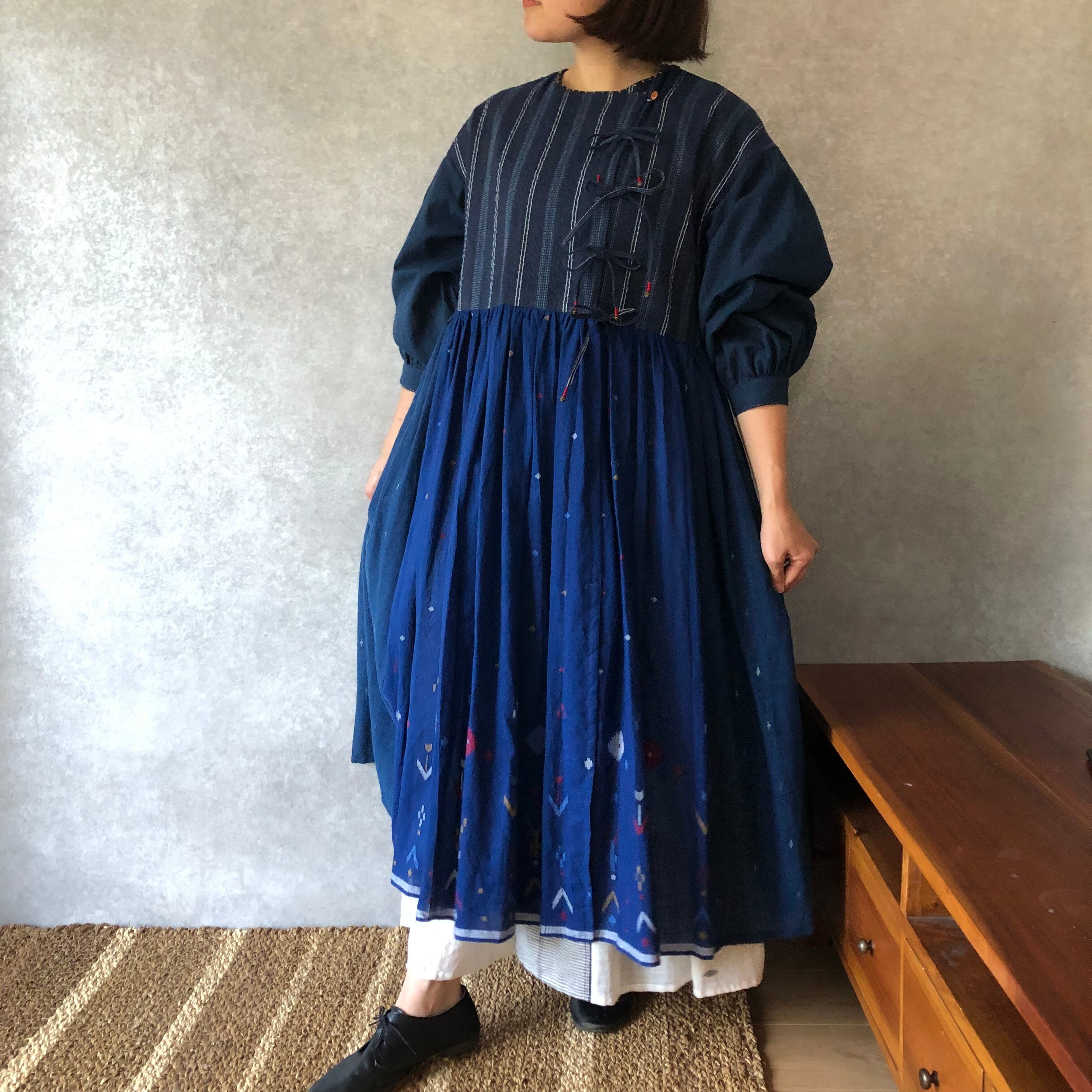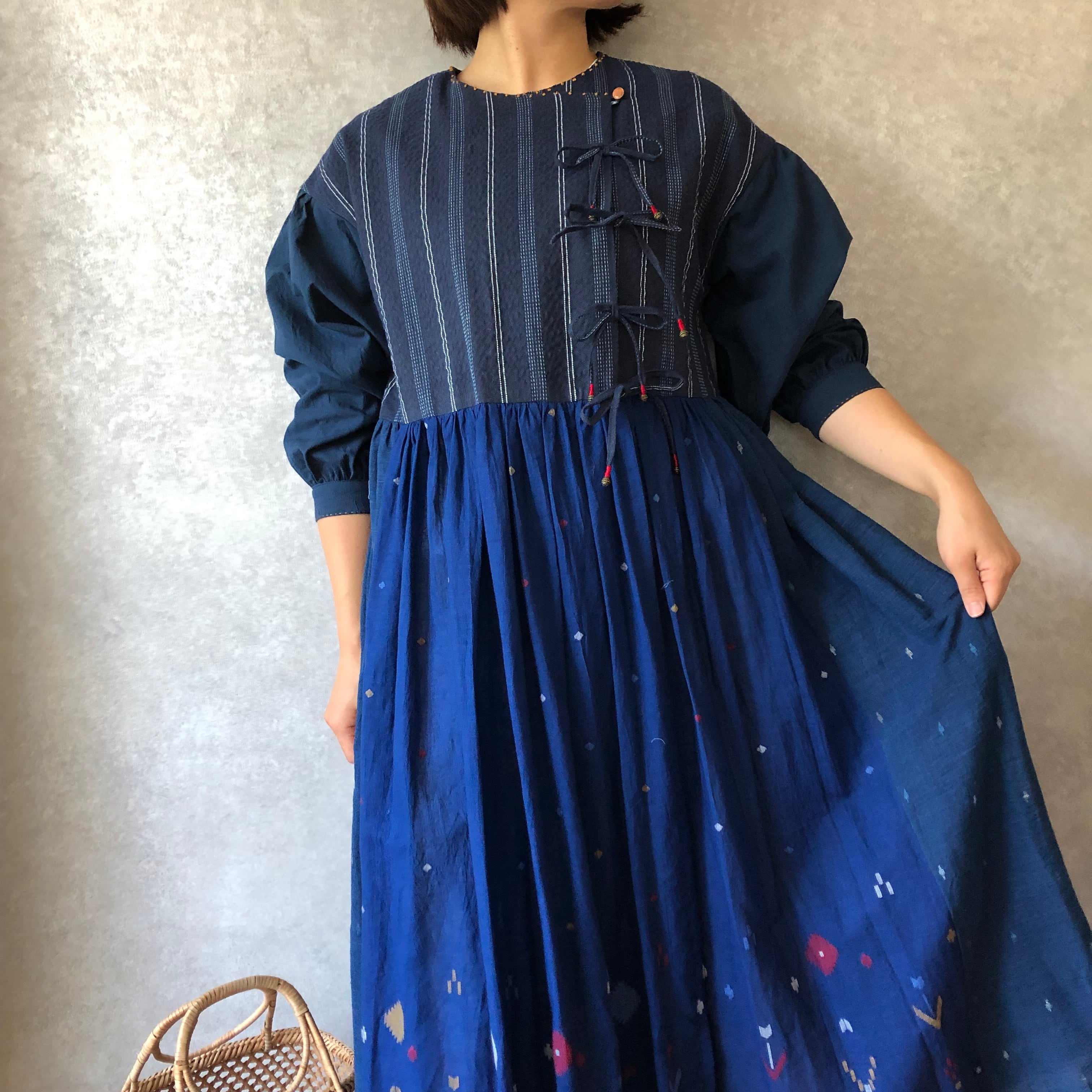 34.【袖丈47センチ】カディコットンリボンワンピース【カディ×紺しじら織】