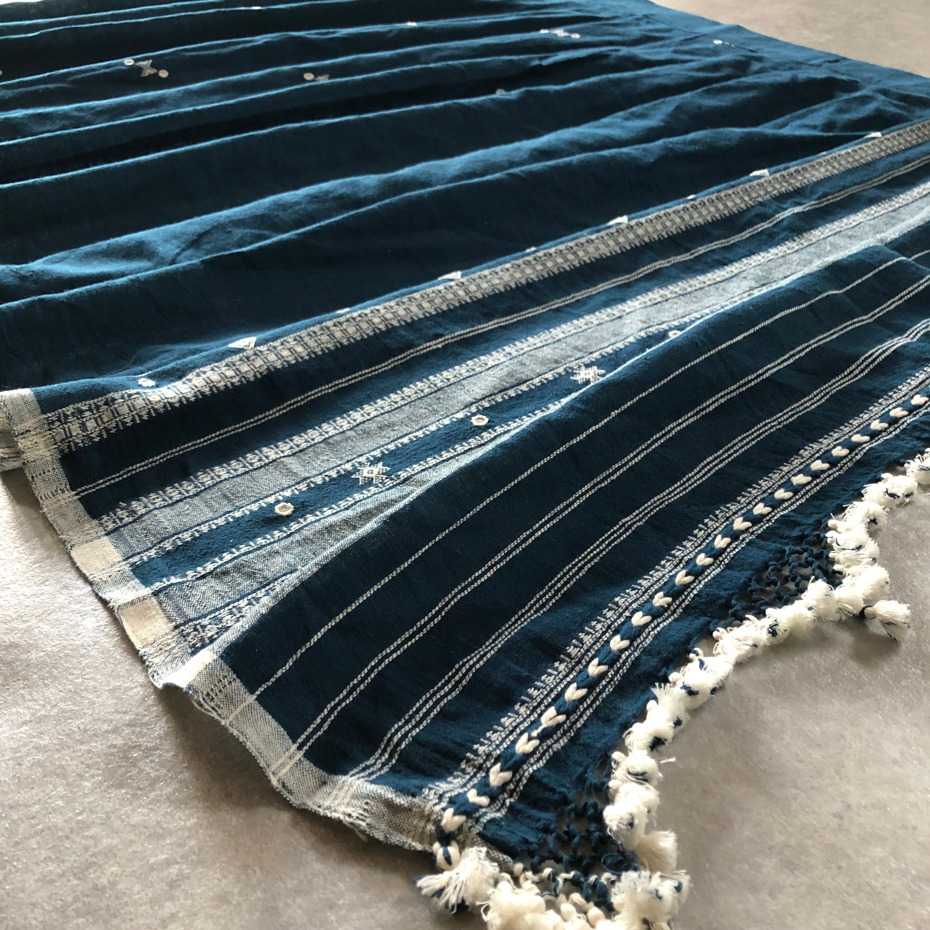 インドの伝統的なミラーワーク(小さな丸い鏡を生地で包み、周りをかがって縫い留める技法)が全面に施されています。光に当たってキラキラと輝く様子がとても美しいです。