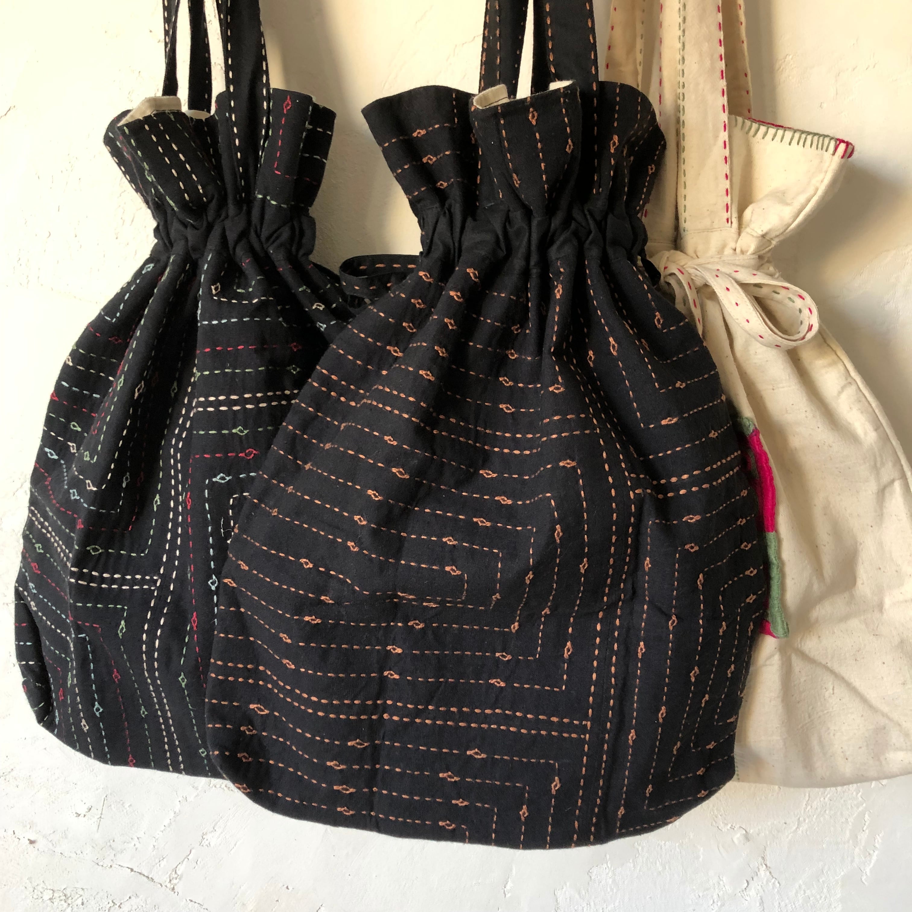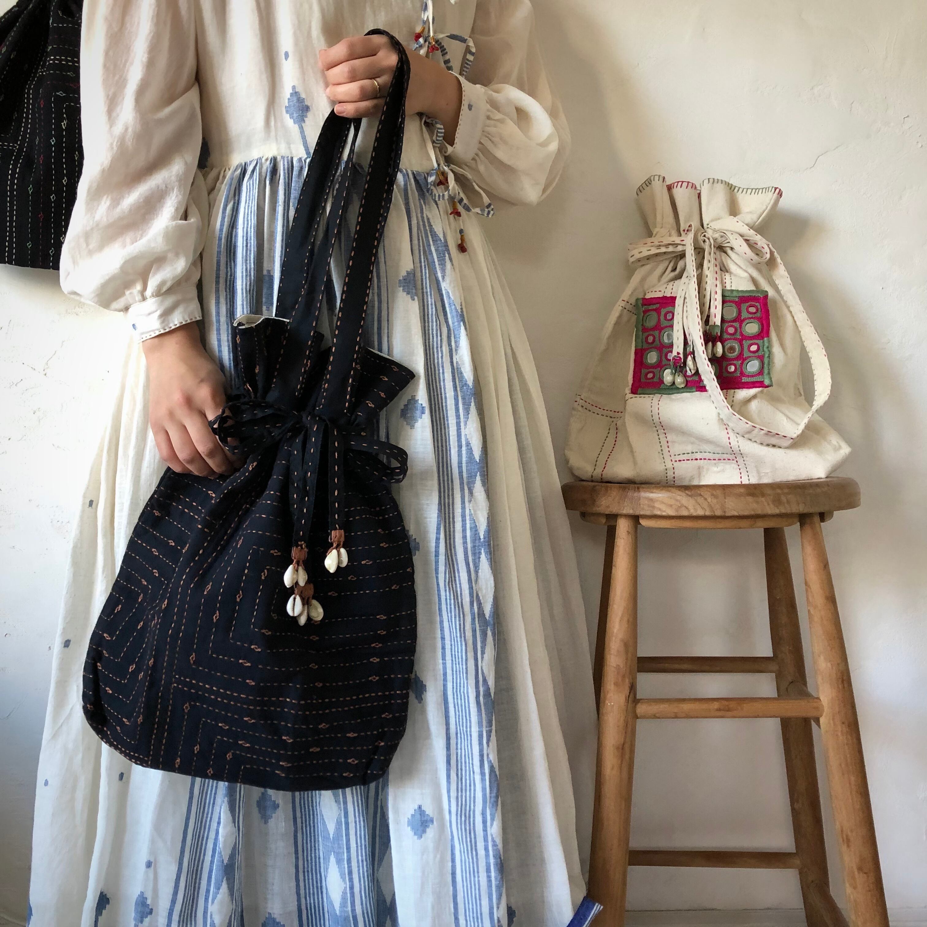 ラバリ族の女性たちの手によって一点一点作られた巾着バッグです。