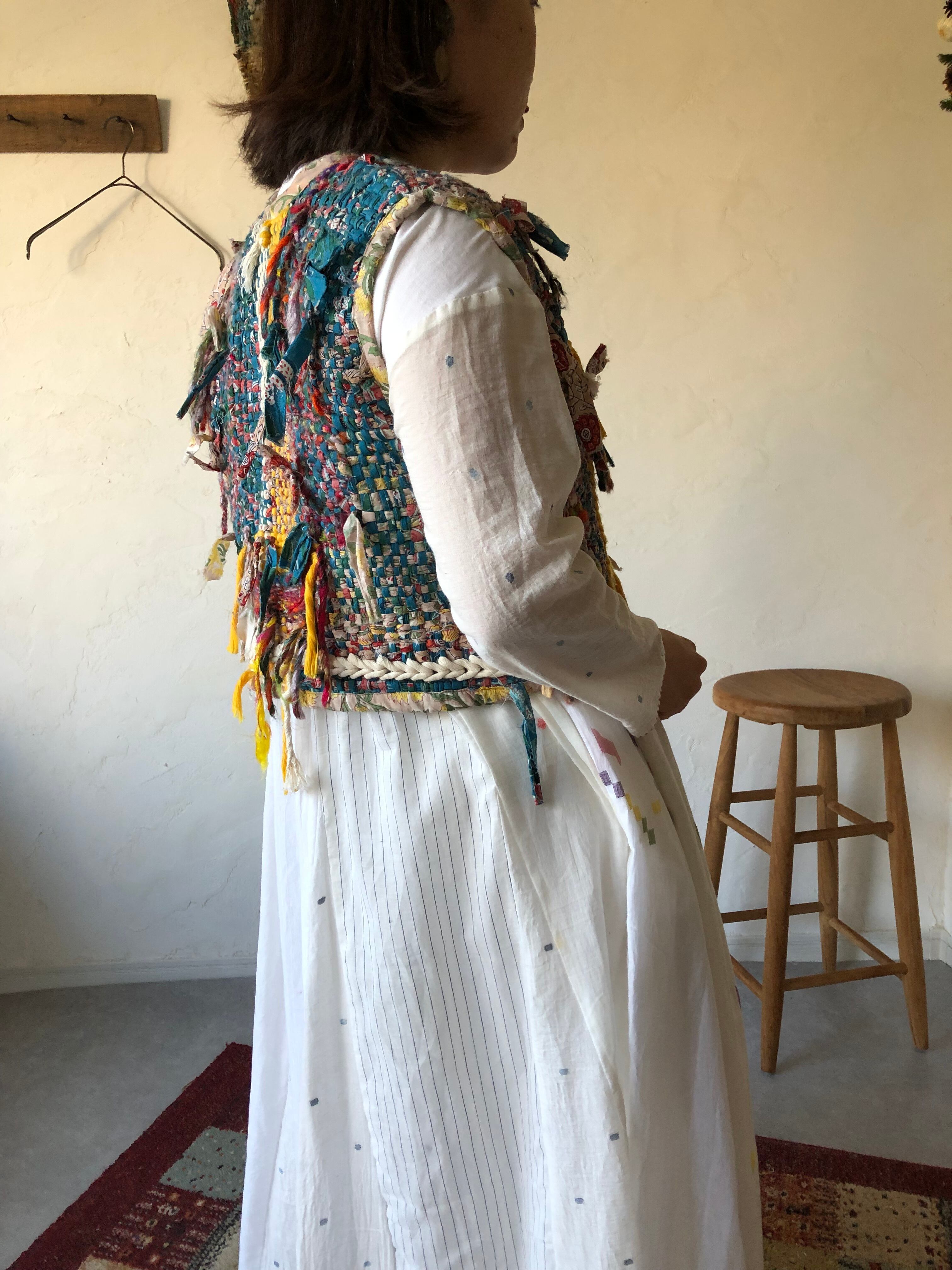 こちらは細く紐状に裂いたブロックプリント生地をメインにシルクサリーのコードやコットンのコードなど、様々な素材を織り交ぜて作られたベストり
